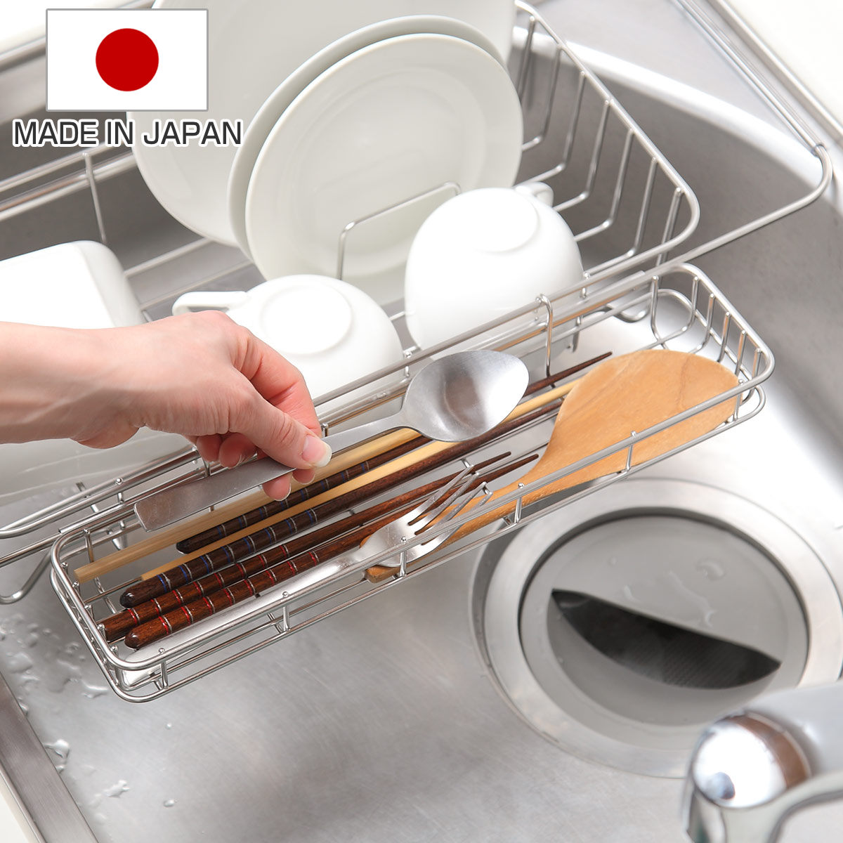 寝かせて置くだけの簡単水切りカトラリーやお箸を寝かせて置いて水切りができます。柄の太いツールやカトラリーケースなども、縦に差し込むタイプのようにポケットがいっぱいになるプチストレスがなく水切りができます。
