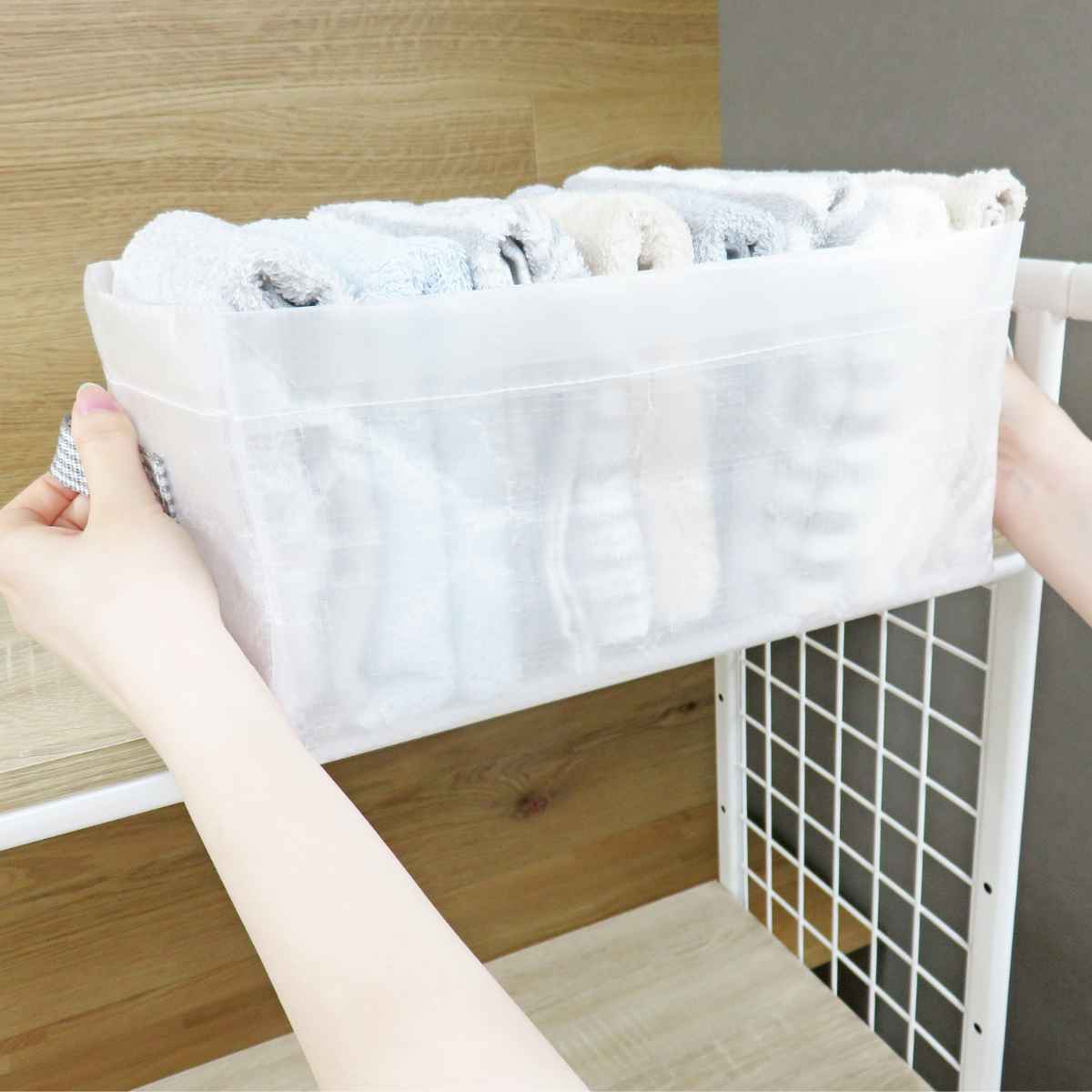 水や汚れが染み込みにくく ほどよく透けて中身がわかりやすい半透明の生地なので、中身がほどよく透けて見えます。どこに何が収納されているか分かりやすいので、家事の時短にもなります。濡れても拭き取りやすく、水や汚れが染み出しにくい素材です。