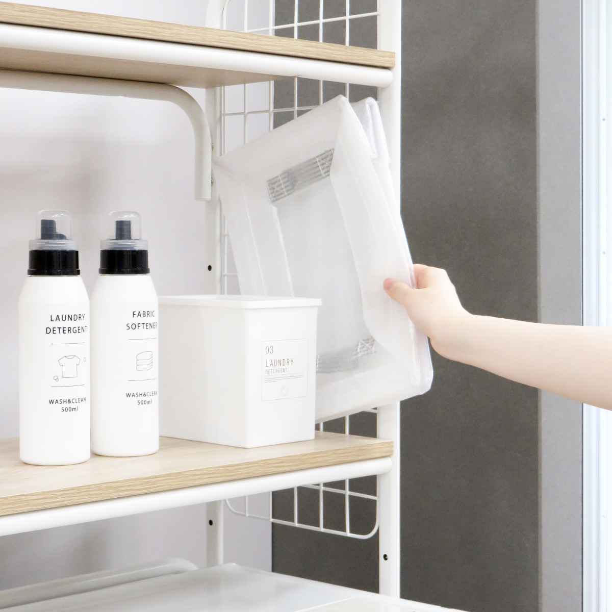 「Sheersto(シアスト)」シリーズは、洗濯機横の隙間やランドリーラックのポール等にも収納を増やすことができます。シアー素材で、ほど良く透け感もあり、隠したいものをすっきり収納できます。「もっとランドリー周りの収納を増やしたい!」を叶える収納シリーズです。