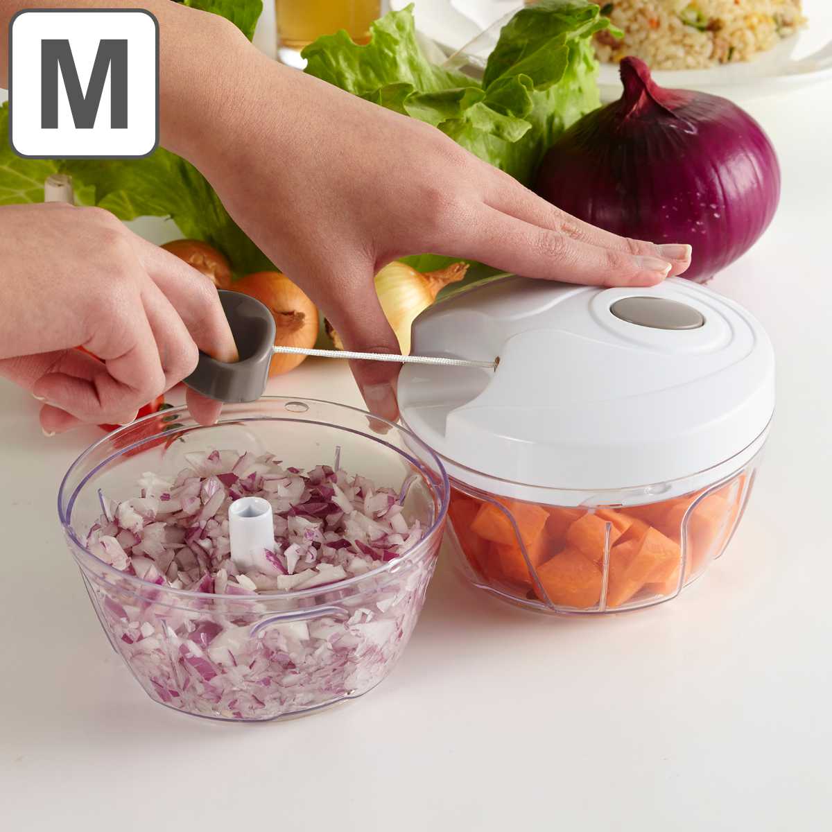 ひもを引っ張るだけで簡単に時短調理フードチョッパーの容器に食材を入れ、あとは取っ手のついたひもを引っ張るだけでみじん切りができます。容器の中の3枚の刃が効率よく食材を切ってくれるので、包丁よりもスピーディーで安全です。また、食材が散らばらず、ニオイが手に付いたり、目が痛くなったりすることもありません。とても簡単に使えるのでお子様も楽しく料理のお手伝いができます。