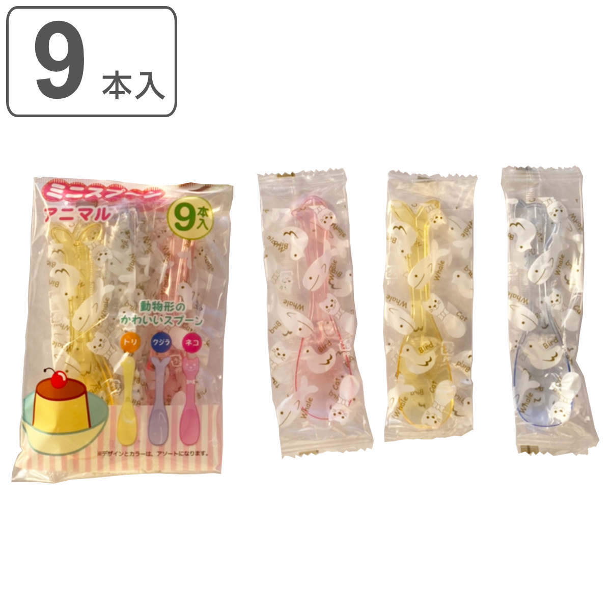 使い捨て 袋入りミニスプーン 9本入 アニマル ( とり くじら ねこ ミニ スプーン プラスチック 袋入 個包装 アイスクリームスプーン 袋入り )