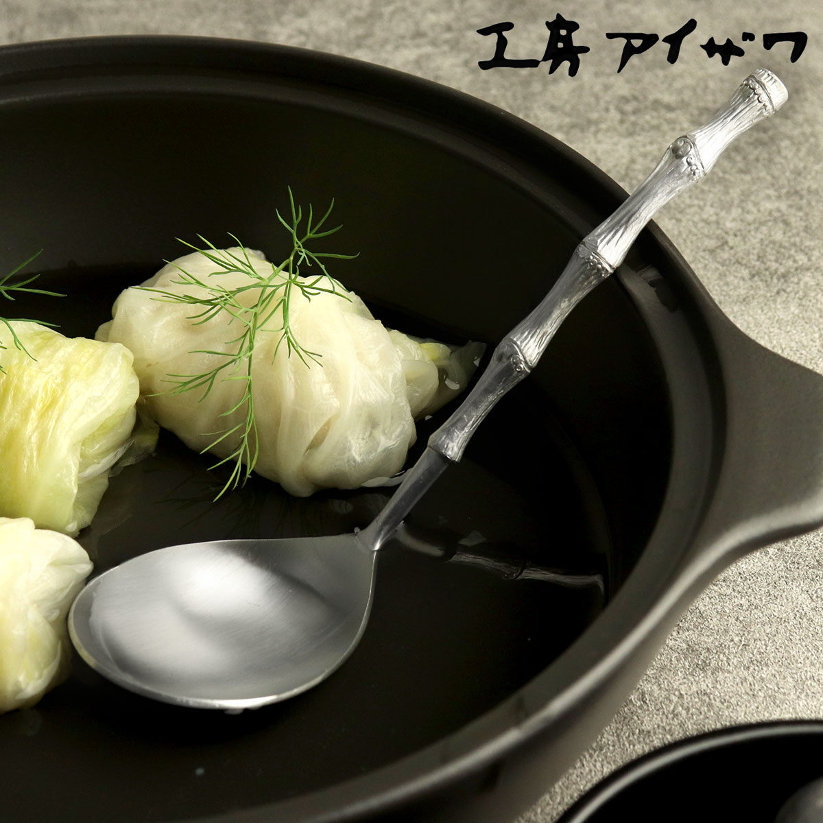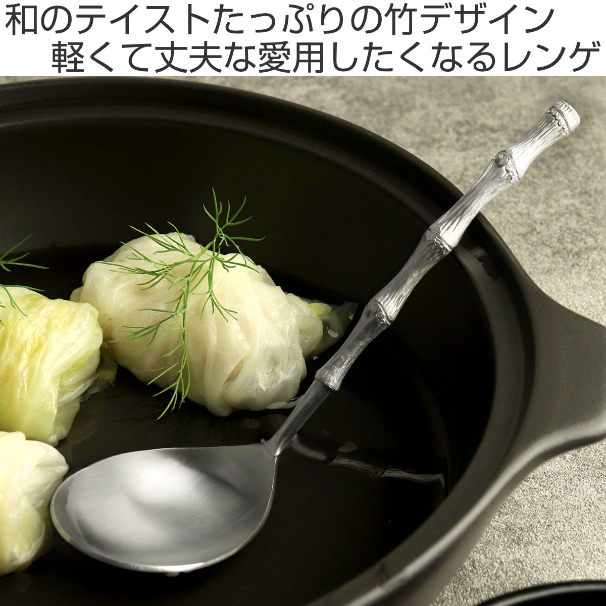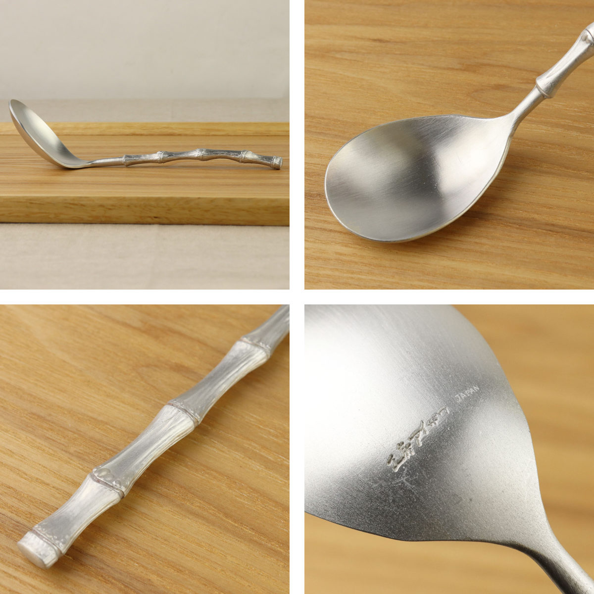柄が竹の形にデザインされたレンゲは和のテイストたっぷり。マットなアルミの質感と相まって、食卓を落ち着きのある雰囲気に演出してくれます。