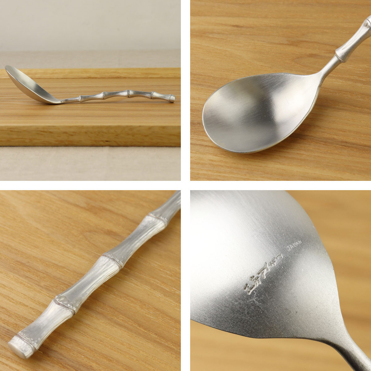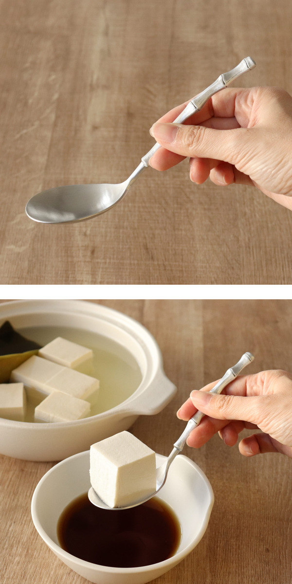 柄が竹の形にデザインされたレンゲは和のテイストたっぷり。マットなアルミの質感と相まって、食卓を落ち着きのある雰囲気に演出してくれます。