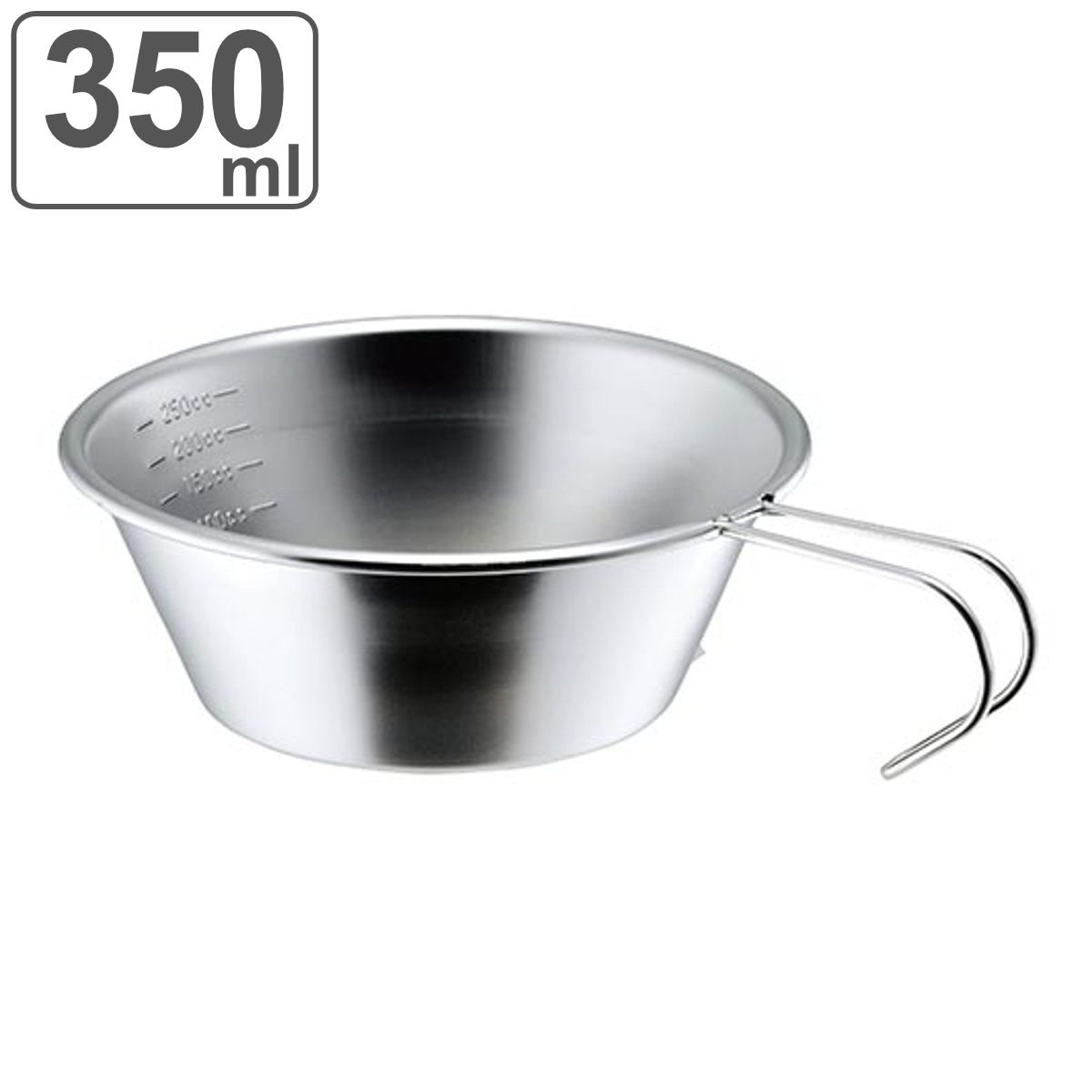 装飾の無いシンプルさが魅力 350ml計量カップや食器替わりにでき、登山・キャンプで1つあると便利なシェラカップです。ステンレス製で落としても割れにくく、保温性が高いためアウトドアで大活躍します。直火・ガスOKのため小鍋にしたり、お湯を沸かしたりなど多目的に使用できます。計量時に便利な目盛付きです。