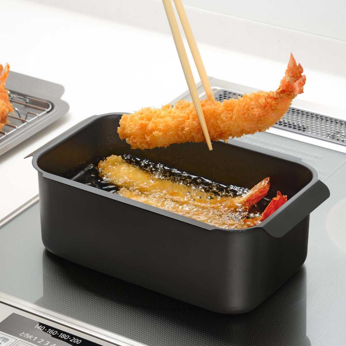 ●長方形の鍋ならエビフライやアスパラなど長い食材もしっかり揚げられます。