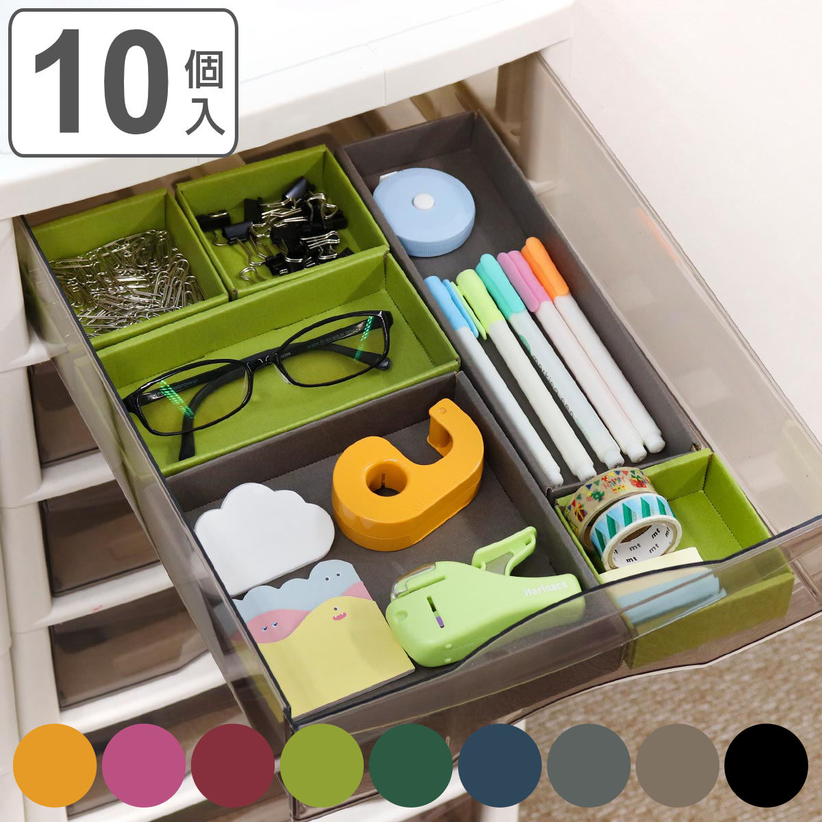 オフィスの机整理に最適のサイズタイプの違うケースが10個セットになっており、全て使用すると一般的な袖机の引き出しにピッタリと収まるサイズ感になっています。高さ3cmなので、オフィス用デスクの浅い引き出しにも引っかからずに使えます。