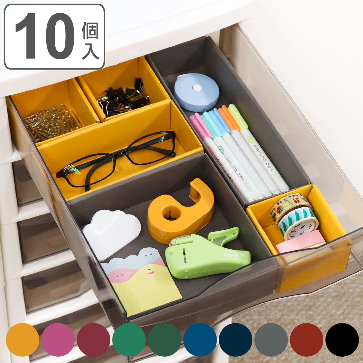 オフィスの机整理に最適のサイズタイプの違うケースが10個セットになっており、全て使用すると一般的な袖机の引き出しにピッタリと収まるサイズ感になっています。