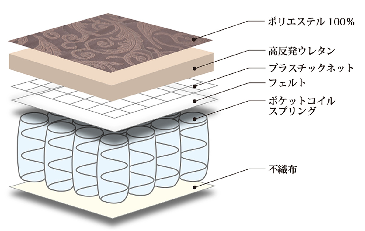 厚さ約13cmとボリュームのあるコイルスプリングマットレスは、膝や腰に負担がかかりにくく、適度な反発力がある高反発ウレタンを使用しています。また、ひとつひとつのコイルが独立して敷き詰められており、マットレスにかかる重さに応じてコイルが点で沈み込む為、身体にしっかりとフィットします。体圧を分散させ理想的で快適な寝心地を実現しました。