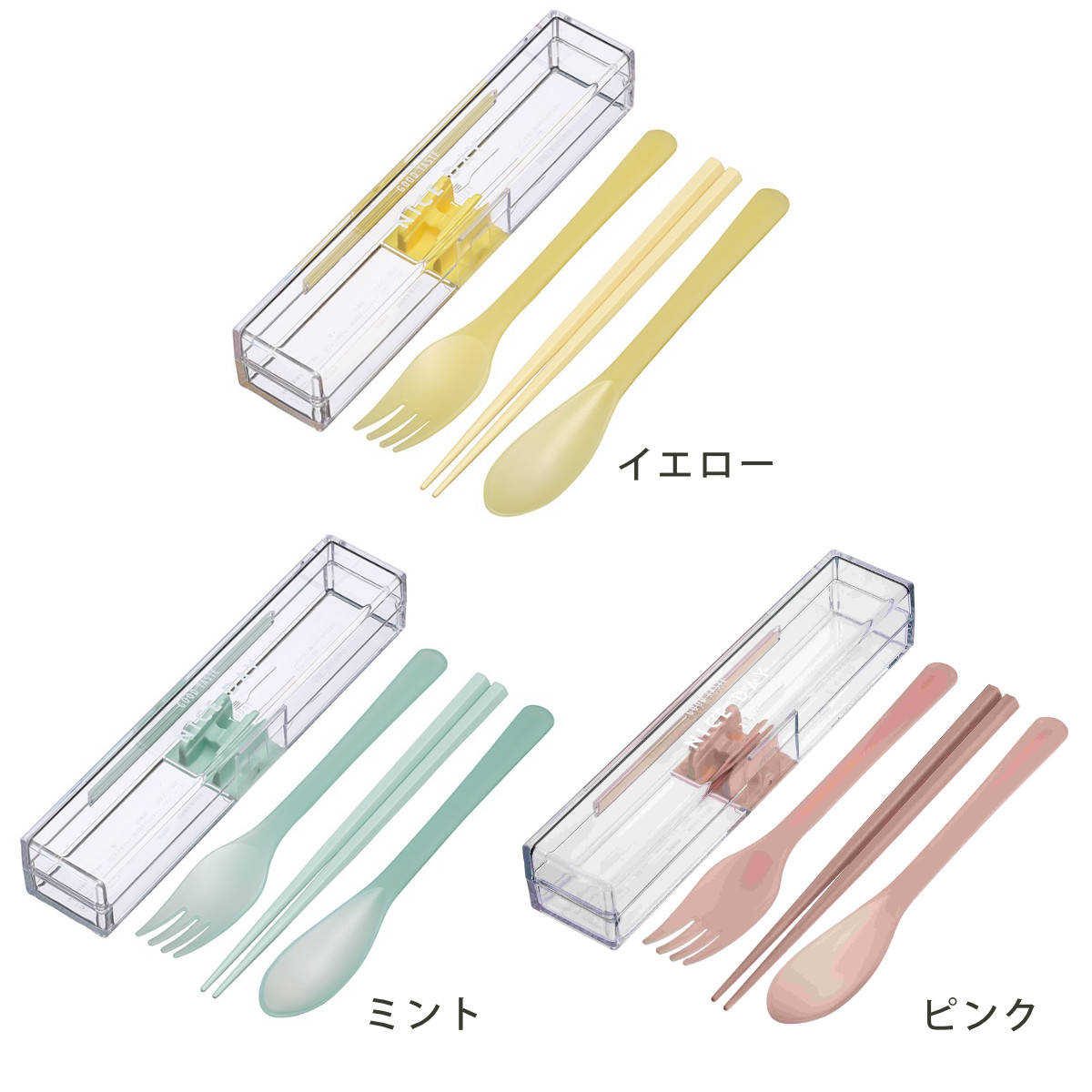 | 材質 | ケース、スプーン、フォーク:飽和ポリエステル 箸:AS樹脂 ユニットホルダー:熱可塑性エラストマー |