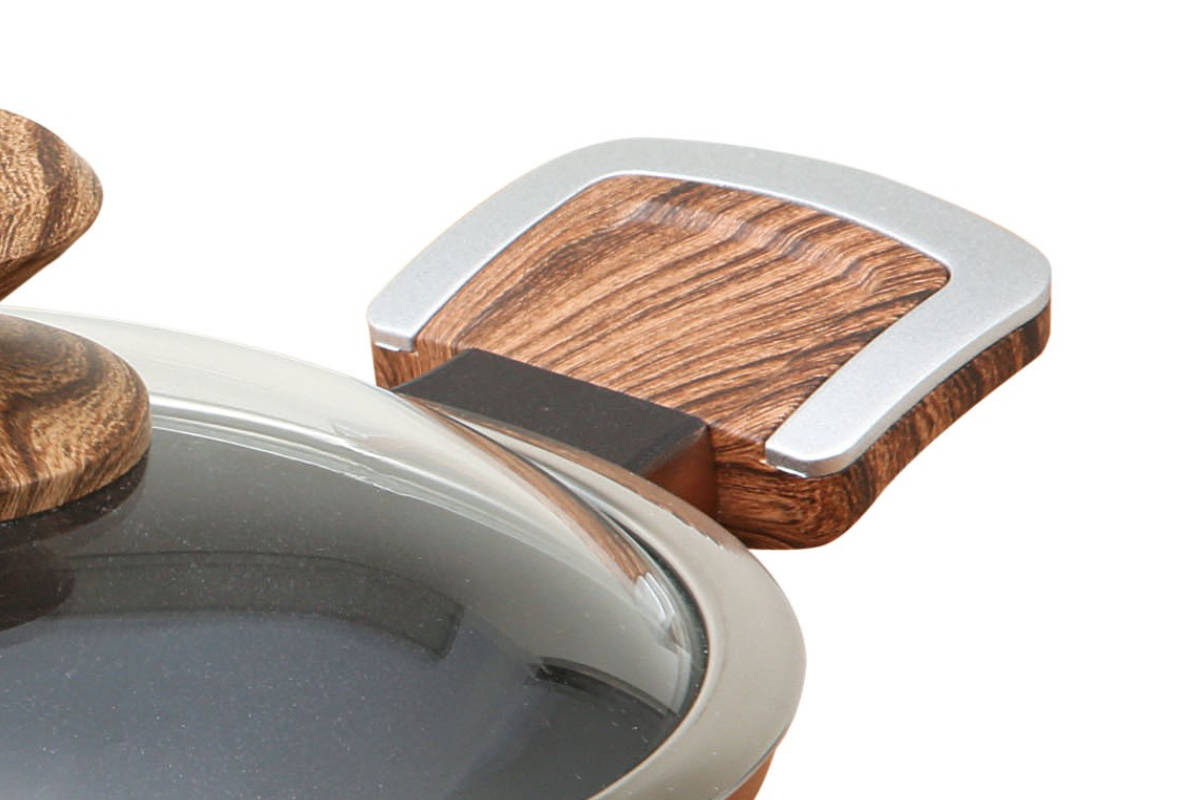 調理に便利なガラス蓋付き強化ガラスの蓋付きで調理中も中が見え便利です。高級感ある木目のつまみは、熱くなりにくく持ちやすい形です。