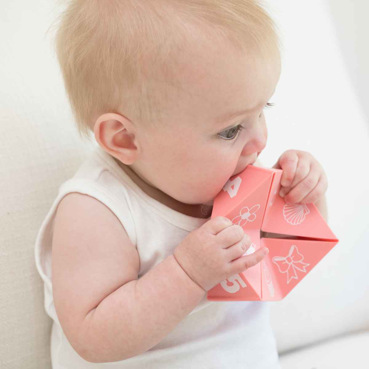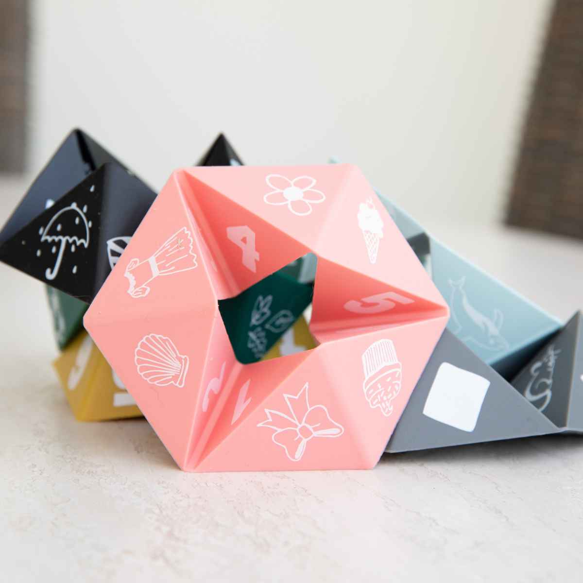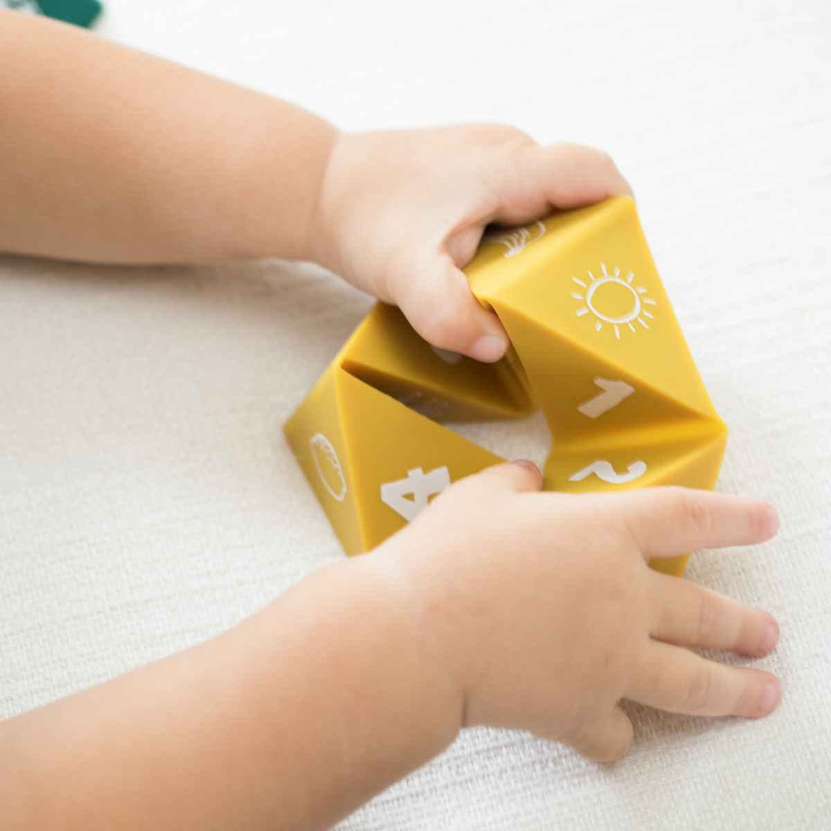 指を入れて形を変えて遊ぶおもちゃとしてはもちろん、歯固めとしてもお使いいただけます。子供たちにカタチや動物、くだもの、数字など、遊びながらさまざまなことを教えることができます。