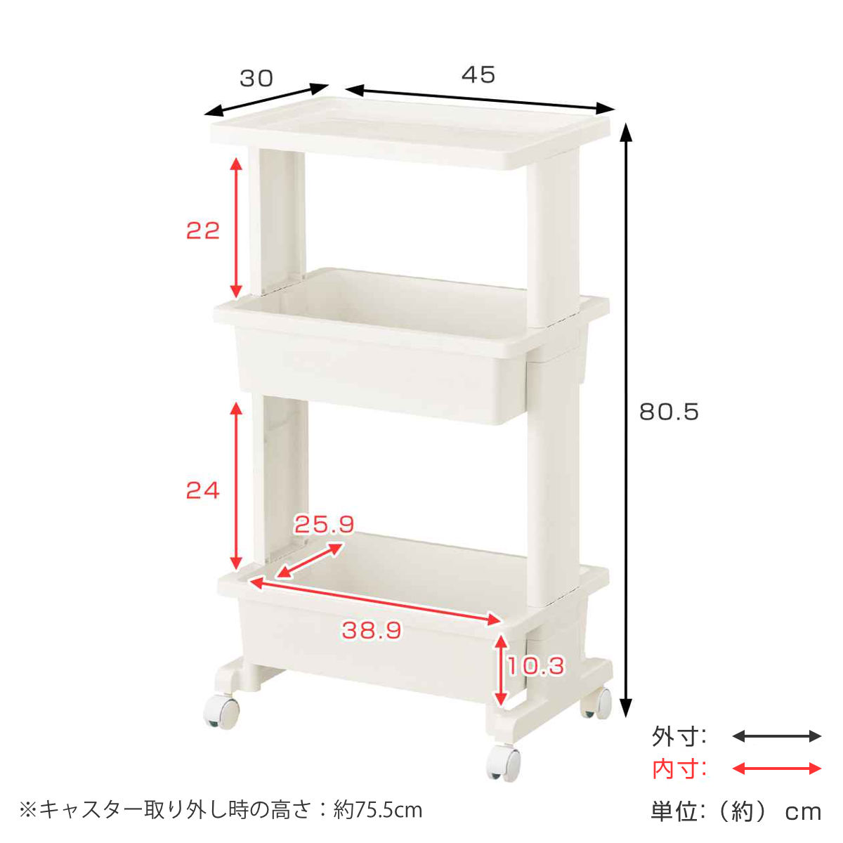 | サイズ | 約 幅45×奥行30×高さ80.5(cm) キャスター取り外し時の高さ:75.5cm |