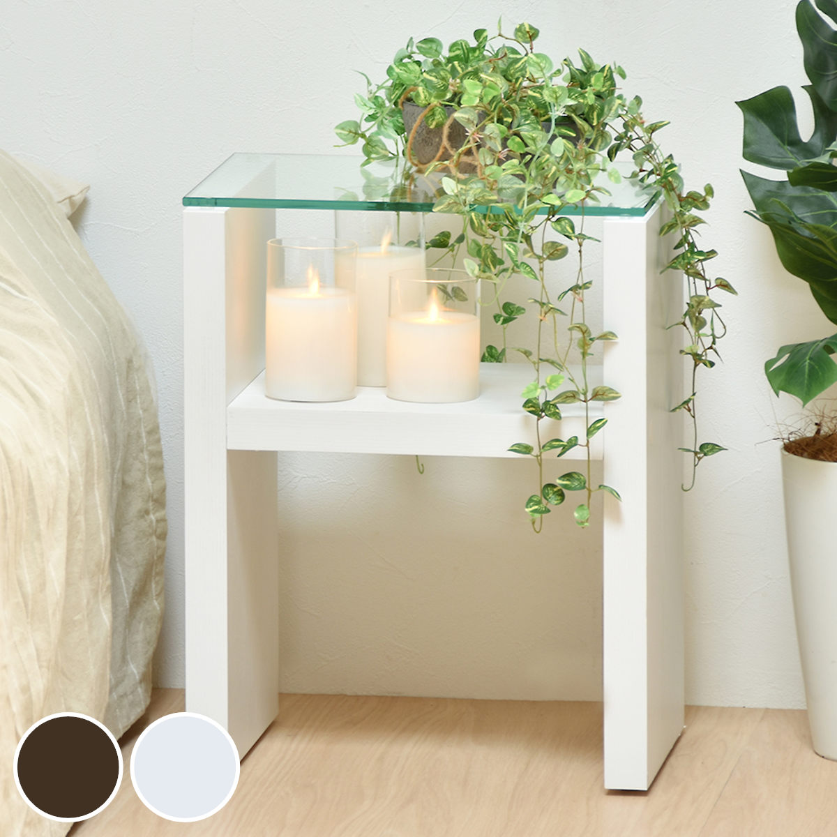| 材質 | 天板:8mm強化ガラス 棚板・側板:中質繊維板にPVC貼り(塩化ビニルシート) |