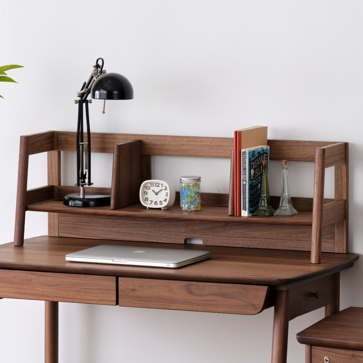 落ち着いた色合いが特徴のウォルナット材を使ったQUADOシリーズのデスク用上棚です。性別や年齢を問わずに使えるシンプルですっきりとしたデザインは、小学生から大人まで長くお使い頂けます。木のぬくもりの中に深みを感じるシックで大人っぽい雰囲気は、どんなお部屋にもすっきりと馴染みます。