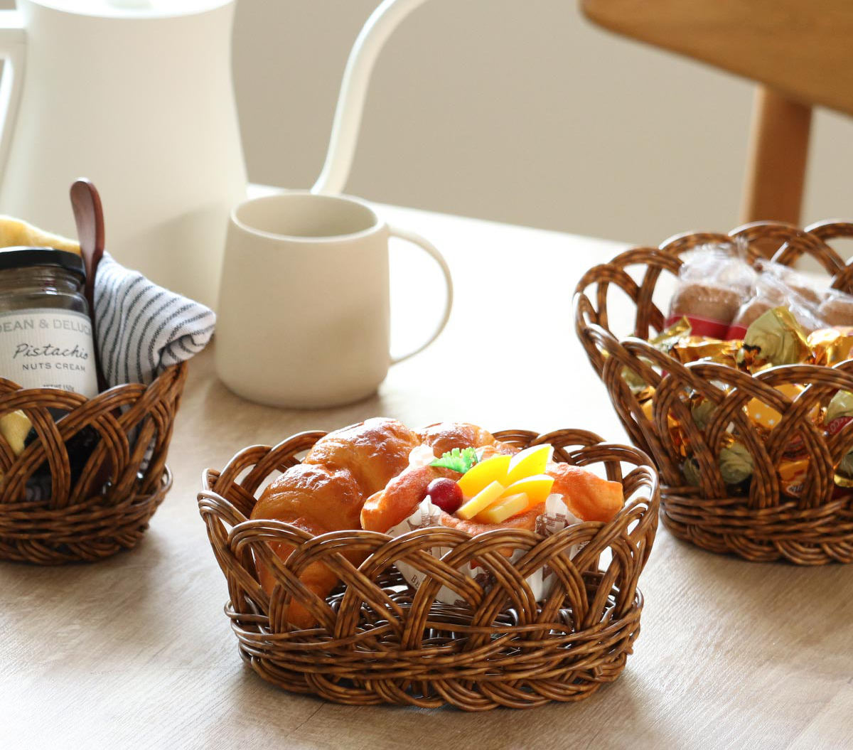 電子レンジが使えるバスケットバスケットは電子レンジに対応しています。パンなどを入れておけば、電子レンジで温めたあとにそのまま食卓に出すことができます。入れ物をバスケットに変えるだけで、いつもの食卓が一気にナチュラルで優しい雰囲気になります。