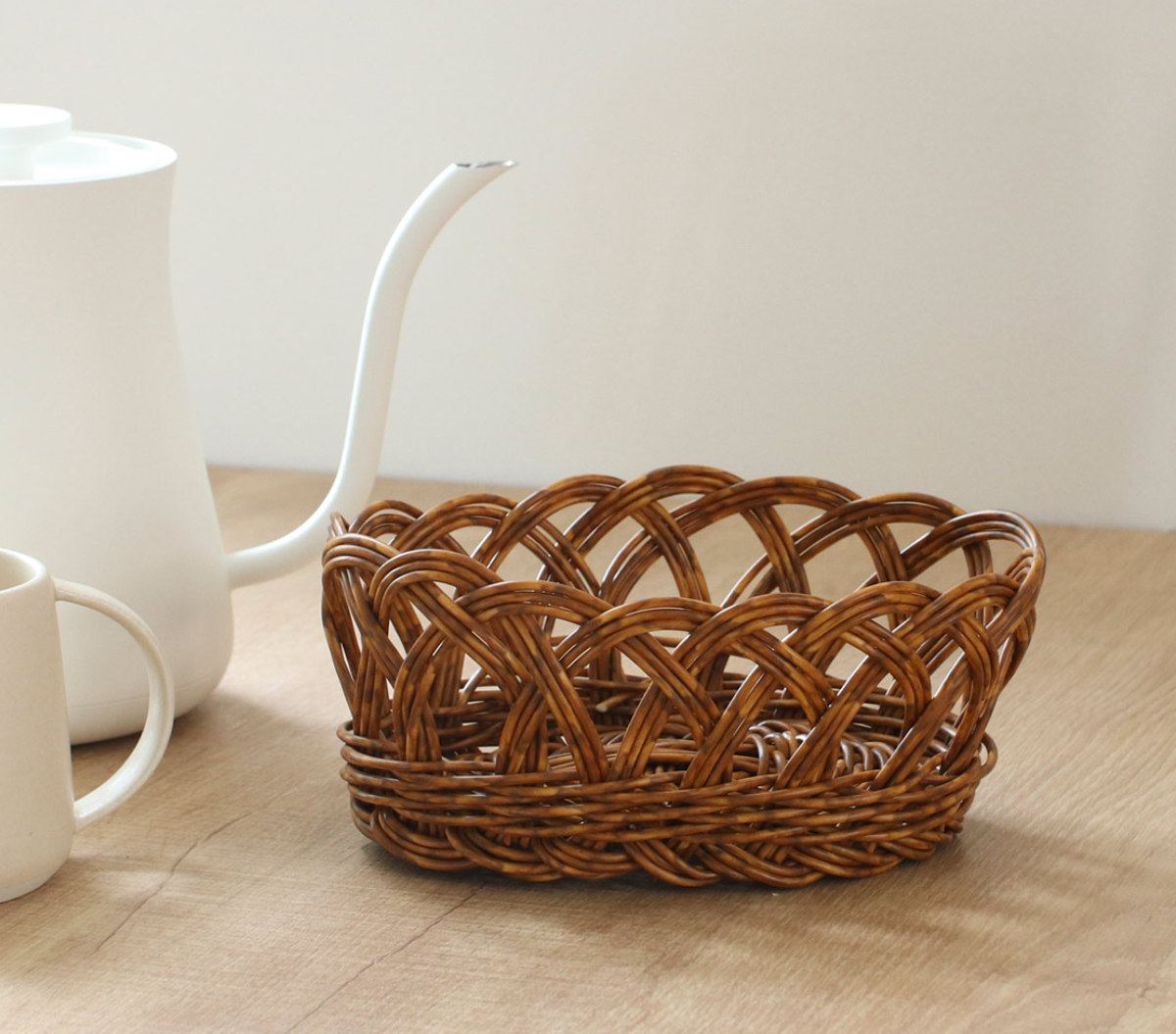 ナチュラルテストなお部屋にぴったり天然素材を使用しているように見えるバスケットは、ナチュラルな雰囲気のお部屋にぴったりのデザインです。水に強いのでキッチンやバスルームでも安心してお使いいただけます。家中の様々な場所で活躍してくれる見た目と機能性にこだわった手編みバスケットです。