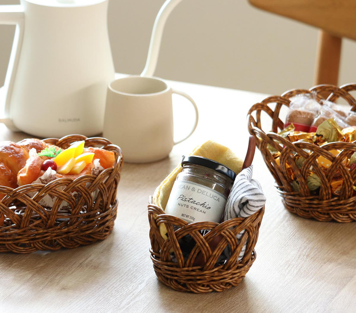 電子レンジが使えるバスケットバスケットは電子レンジに対応しています。パンなどを入れておけば、電子レンジで温めたあとにそのまま食卓に出すことができます。入れ物をバスケットに変えるだけで、いつもの食卓が一気にナチュラルで優しい雰囲気になります。