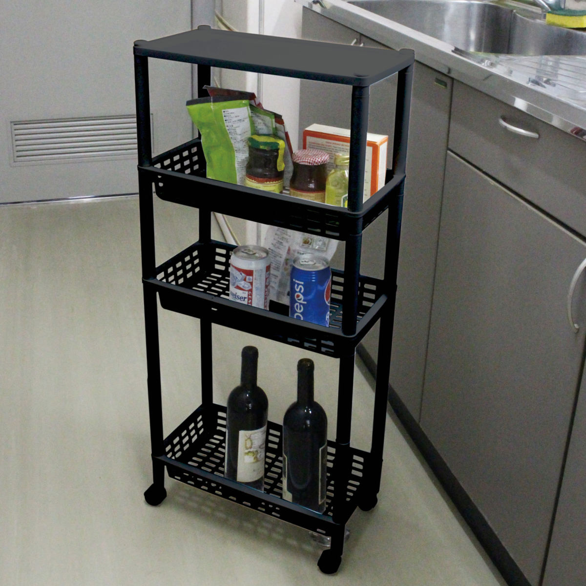 隙間収納でキッチンをすっきり整頓●散らかる小物やストック類などをすっきりと整頓できる、樹脂製の4段ワゴンです。