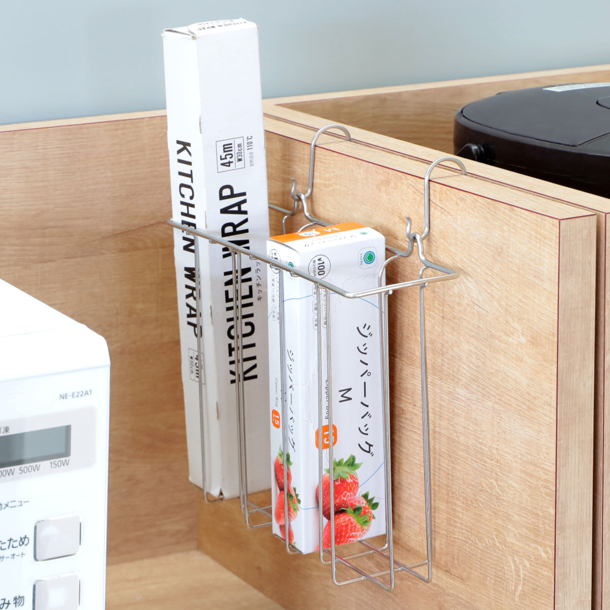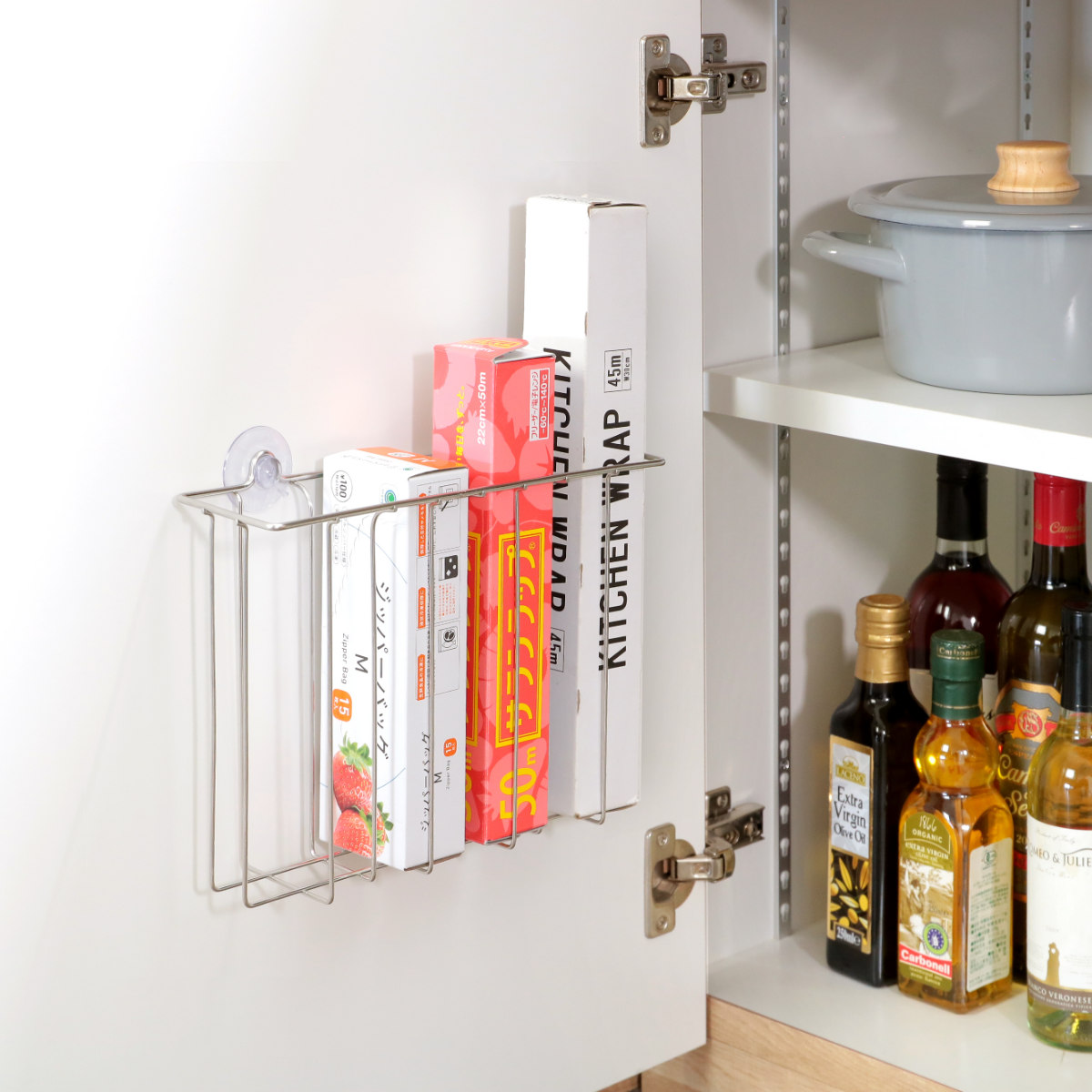 ラップ、アルミホイル、オーブンシート、保存袋などキッチンでよく使う消耗品を立ててすっきり収納できます。見やすいワイヤータイプは使いたい時にすぐに手に取ることができます。