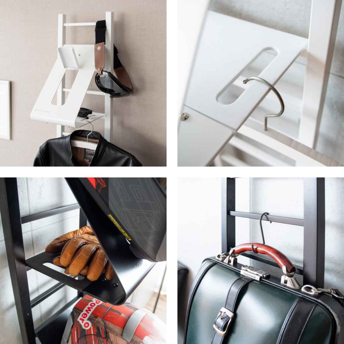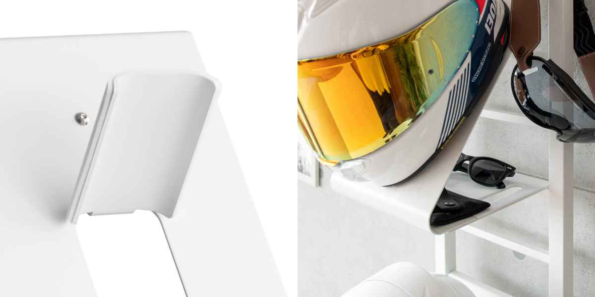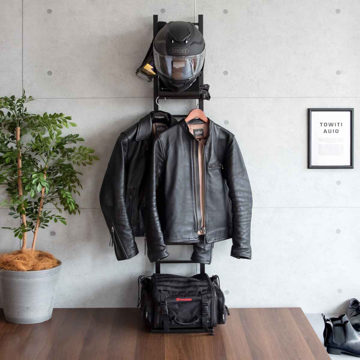 スタンド上にはゴーグルなどが引っ掛けられます。ヘルメットフックの裏側は、グローブやサングラスなど小物の収納に最適です。フック裏は左右に穴があいており、市販のハンガーやフックが掛けられるのでジャケットを掛けられます。ハシゴフレームに市販のS字フックを使えばカバンもかけられます。スタンドベース部分は、カバンや収納ボックスが置けます。