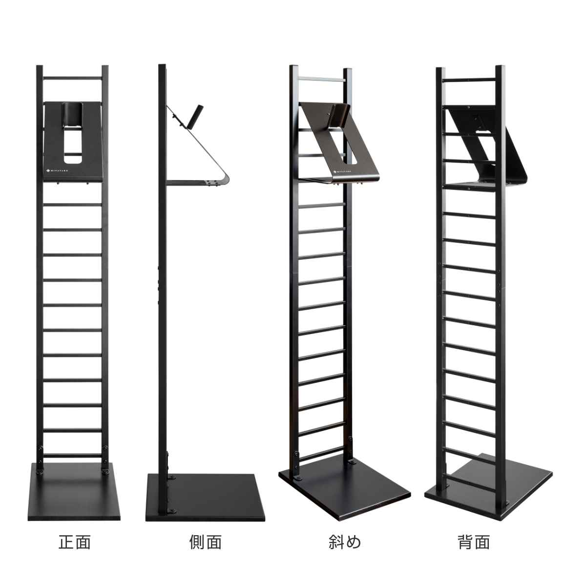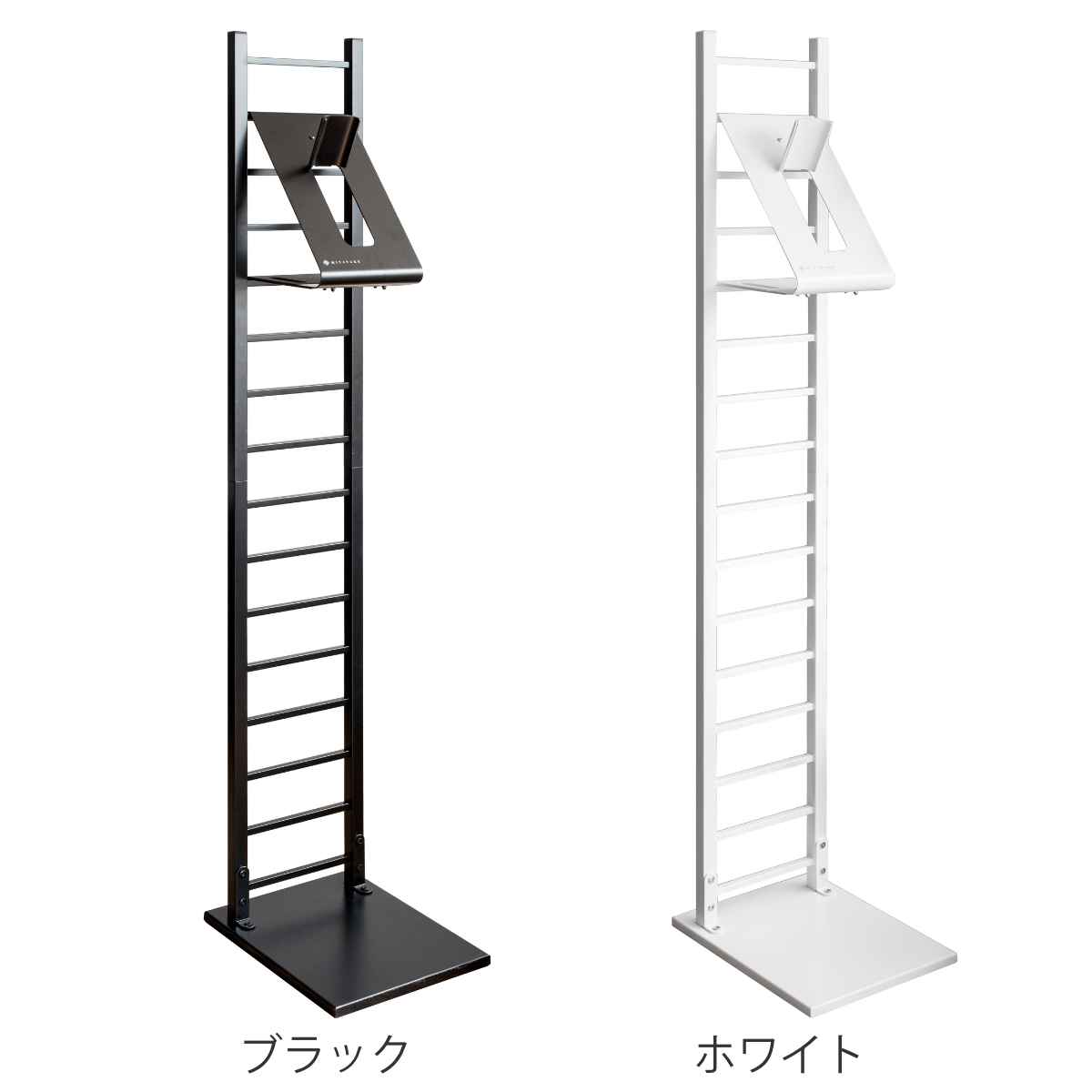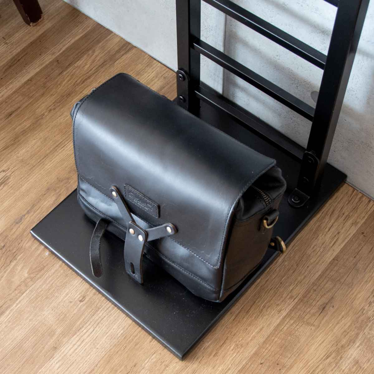 スタンド上にはゴーグルなどが引っ掛けられます。ヘルメットフックの裏側は、グローブやサングラスなど小物の収納に最適です。フック裏は左右に穴があいており、市販のハンガーやフックが掛けられるのでジャケットを掛けられます。ハシゴフレームに市販のS字フックを使えばカバンもかけられます。スタンドベース部分は、カバンや収納ボックスが置けます。