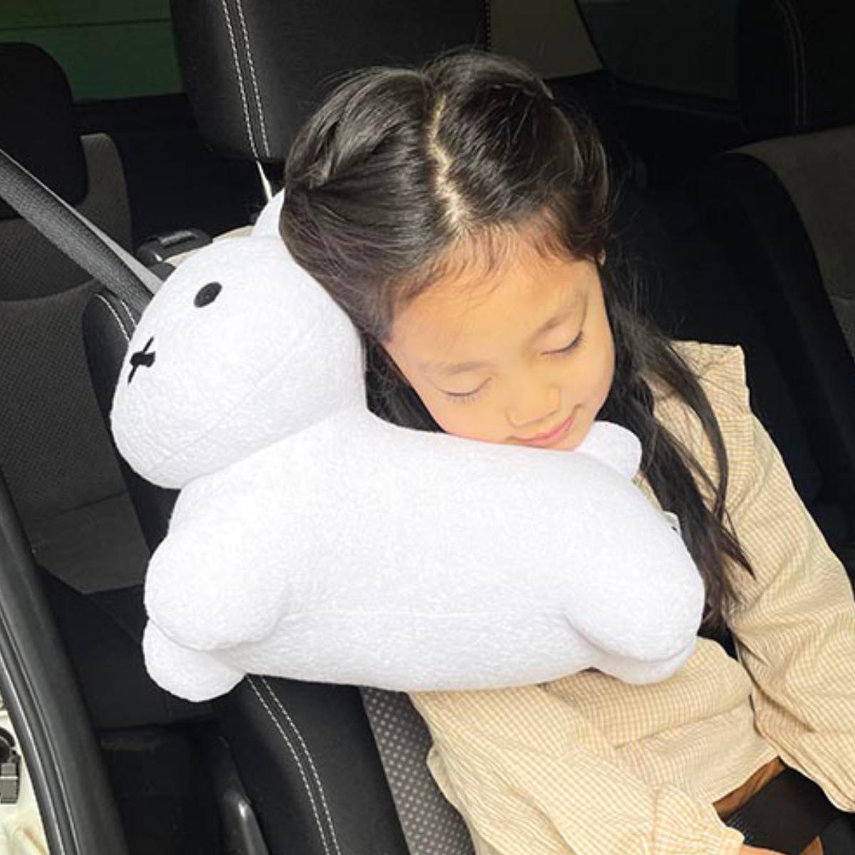 ドライブ中のお昼寝タイムに首を優しくサポートドライブ中のお昼寝タイムにお子さまの首が曲がりすぎるのを軽減してくれるクッションです。ふんわりした手触りの大きなミッフィーが、首を優しく支え、お昼寝中のお子さまの頭がぐらぐらするのを防いでくれます。汚れても手洗いできるため、清潔にお使いいただけます。
