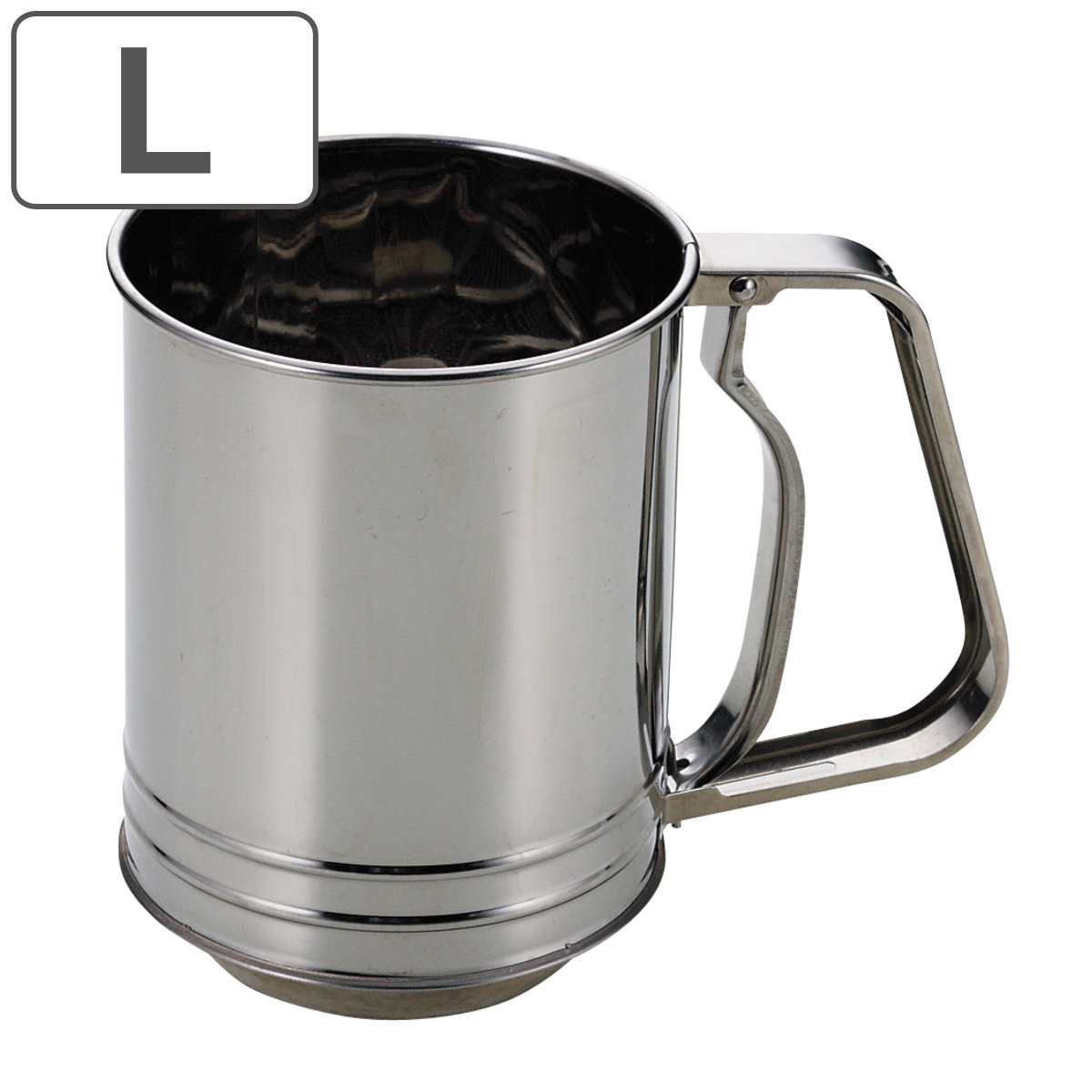 片手でらくらく ステンレス製自動粉ふるい Lステンレス製自動粉ふるいは、持ち手のついたカップ型になっており、片手でハンドルを握ったり離したりするだけで、素早く粉をふるうことが可能です。粉ふるいを左右に動かす必要もないため、粉がまわりに飛び散らないのも嬉しいポイントです。サビに強く衛生的なステンレス製です。