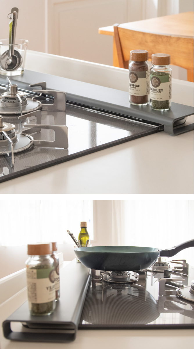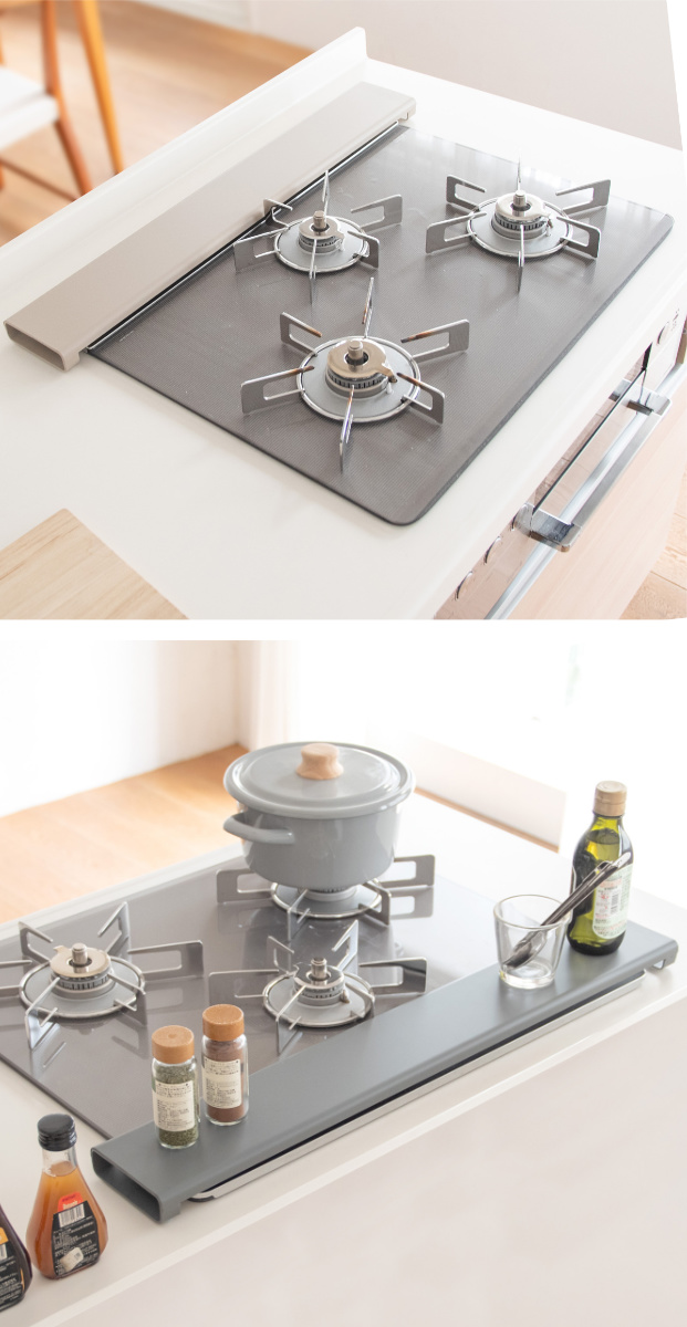 ●フラットな天板なので、上に調味料を置いたり、調理中のフライパンなどの一時置きにも便利です。