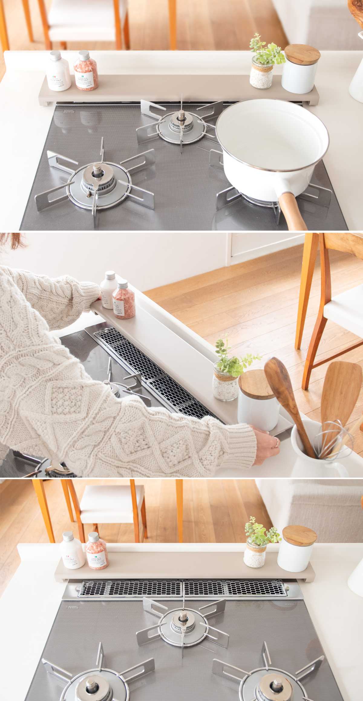 上に物を乗せたまま動かせるグリルをお使いになる際は、カバーごとスッと奥にずらすだけ。上に物を乗せたままで動かせるので、わずらわしさを感じません。シンプルで簡単だから、ストレスなく日常にすっと馴染みます。