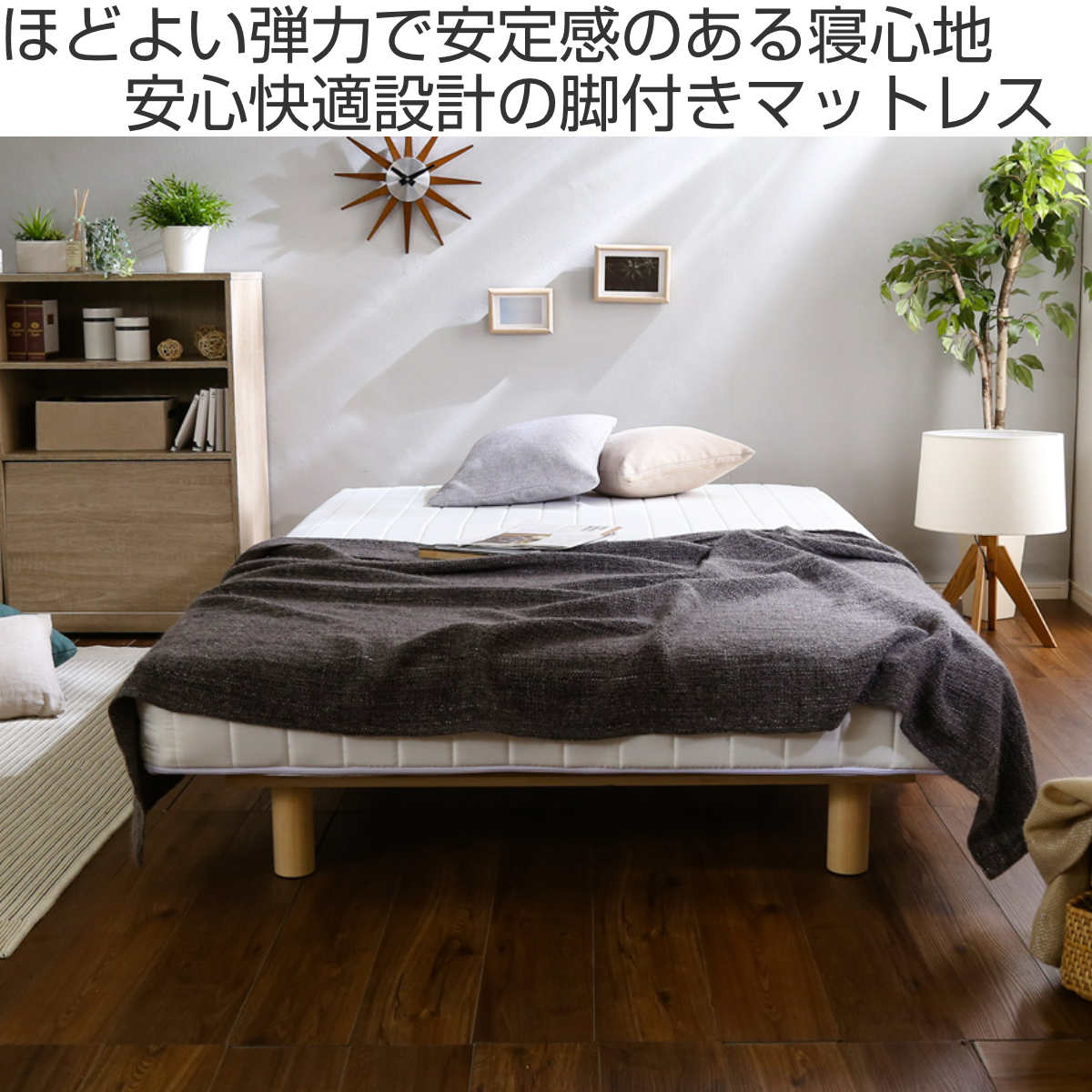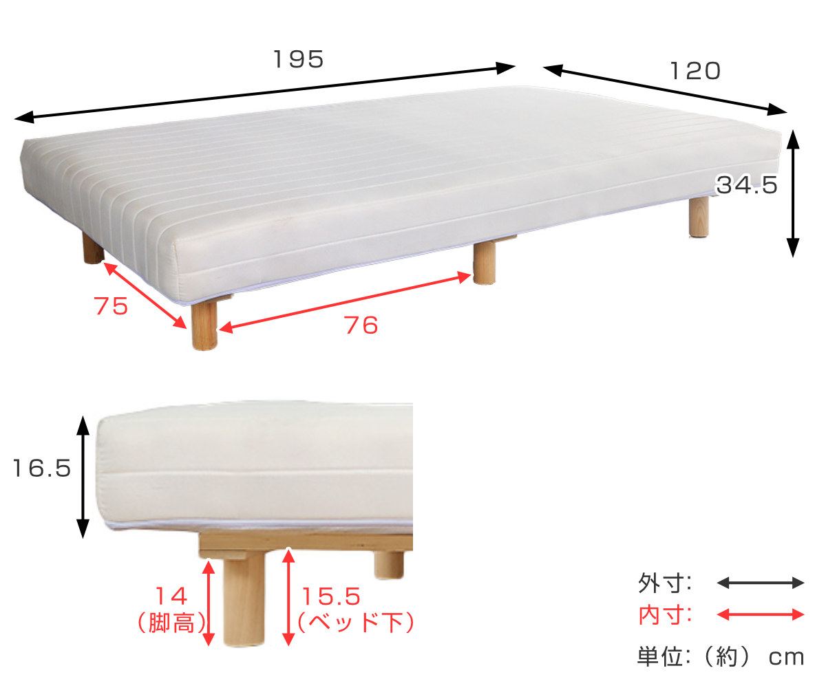 ボンネルコイル セミダブル継ぎ目のない、一体型の脚付きマットレスです。フラットな寝心地で、しっかり身体を受け止めます。一人でゆったり使いたい方や、体格の良い方におすすめのセミダブルサイズです。フレームがないシンプルな構造なので、場所を取らずに設置できます。