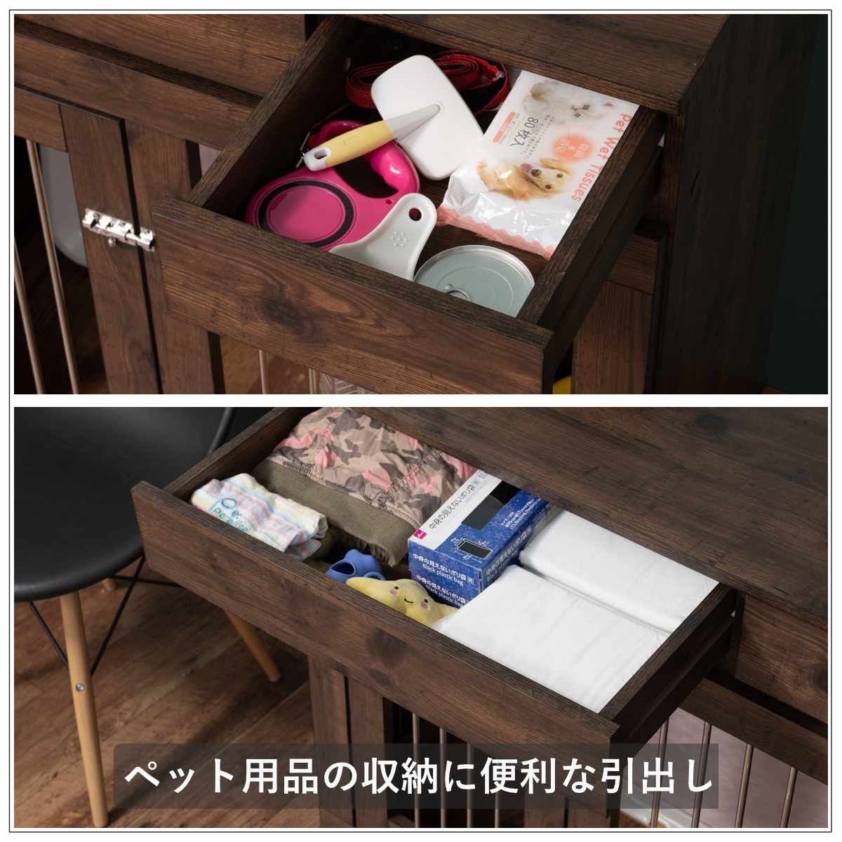 上段には大きさの異なる引出しが付いています。大きな引出しにはペットシーツやリード、おもちゃなどを収納できて便利です。小さな引出しには、缶詰などのストックやブラシなどの小物類の収納にお使いいただけます。