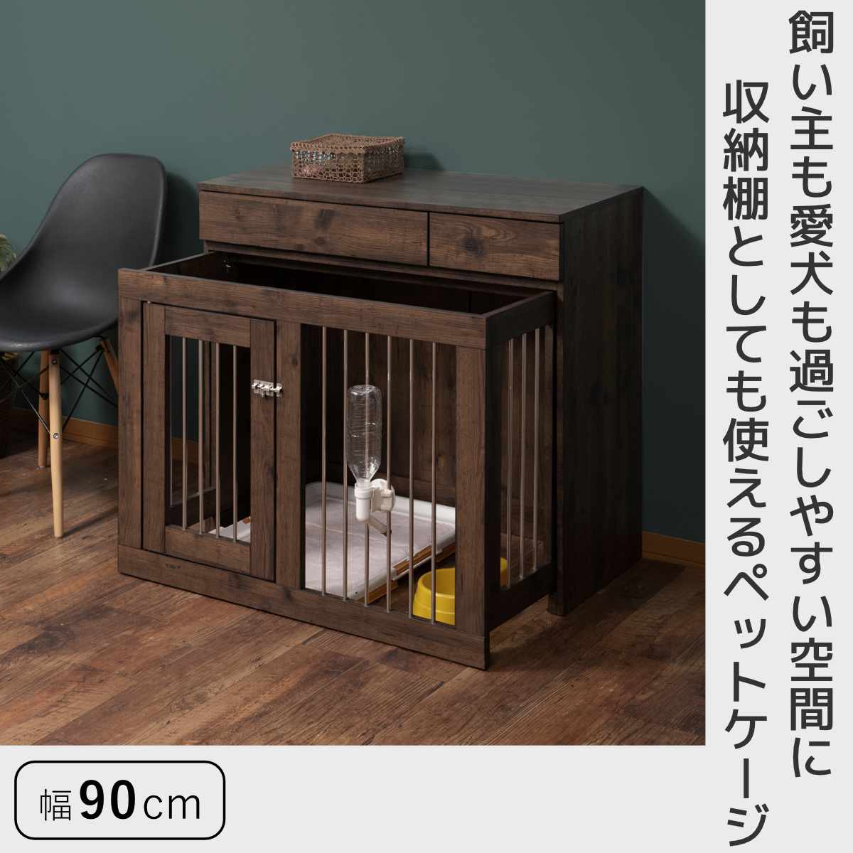 ●機能性とインテリア性を兼ね備えたペットケージ幅90cmです。