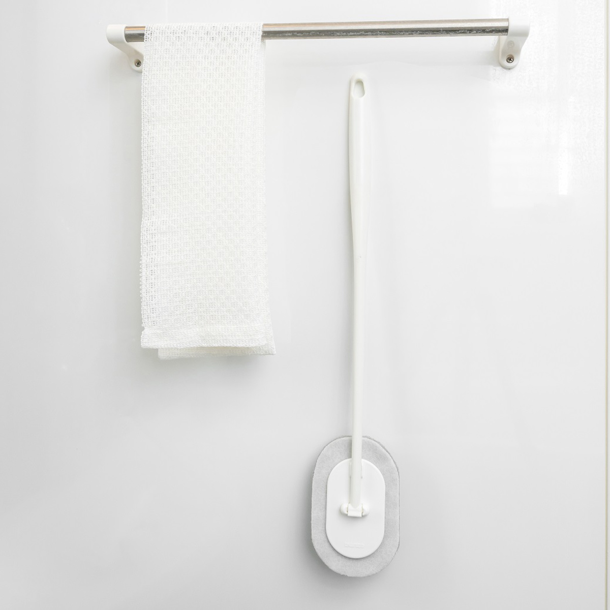 マグネットで浴室の壁にピタッと収納 柄付きバスブラシ身近なところにサッとしまえて、いつでも使えるハンディタイプのバスブラシです。磁石の力で壁面に浮かせて収納でき、隠さなくてもいいスマートなデザインが魅力です。ヘッド部分は壁に当たらないため、水切りもできて衛生的です。