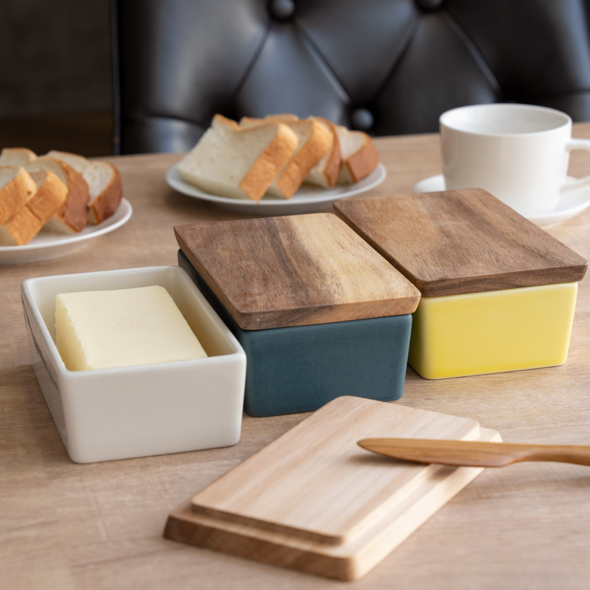 器の部分は洗いやすい半磁器製、蓋はアカシア材を使用しています。市販のバター200gがちょうどよく収まり、そのまま冷蔵庫へ入れれて便利です。ナチュラルな雰囲気のホワイト、アクセントカラーにもなるイエローとブルーの3色です。