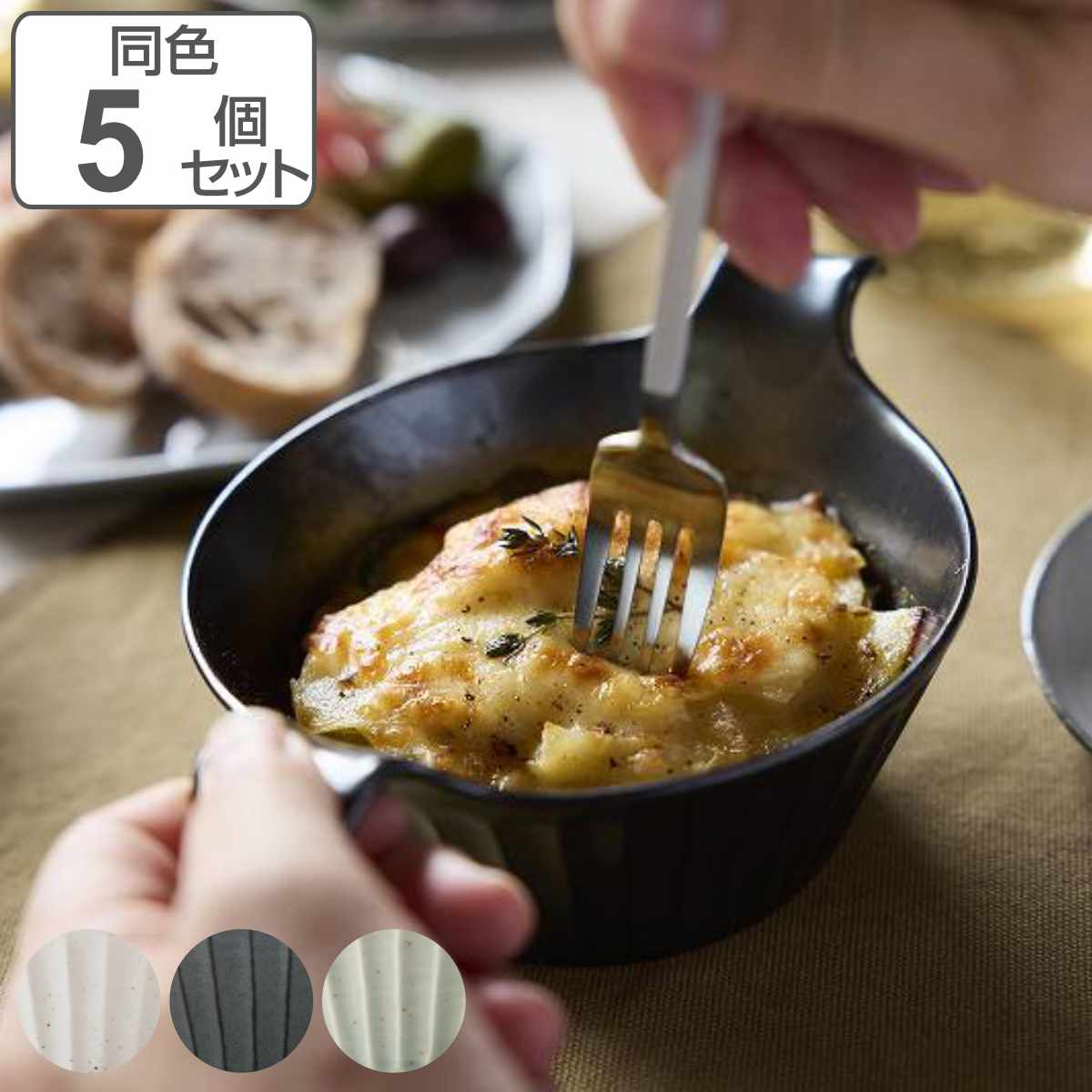温かみのある陶器製のグラタン皿 19cm 同色5個セット出来た料理を熱々のまま食卓へ運んで食べられるグラタン皿です。熱が伝わりにくく冷めにくい陶器製で、熱いものを入れても安心して持つことができます。様々なお料理を盛り付けやすいので日常使いがしやすいです。