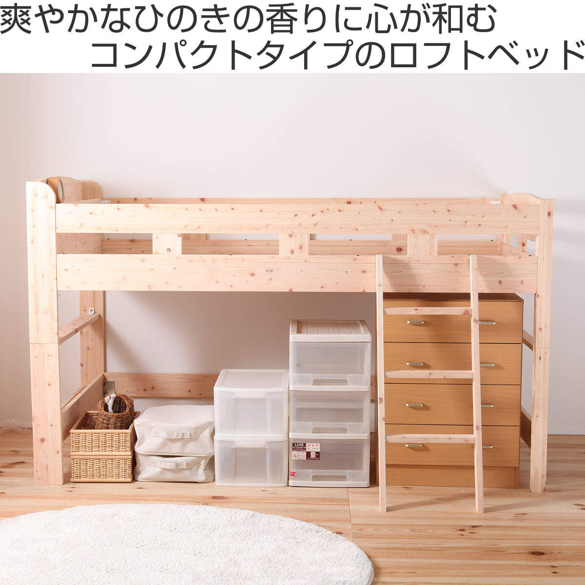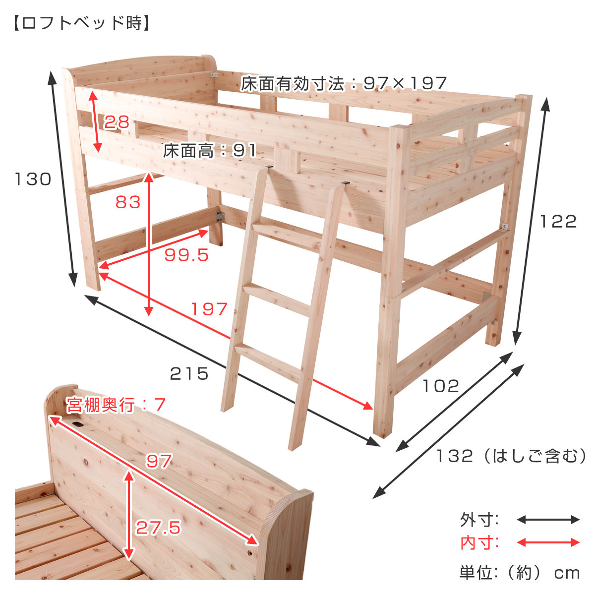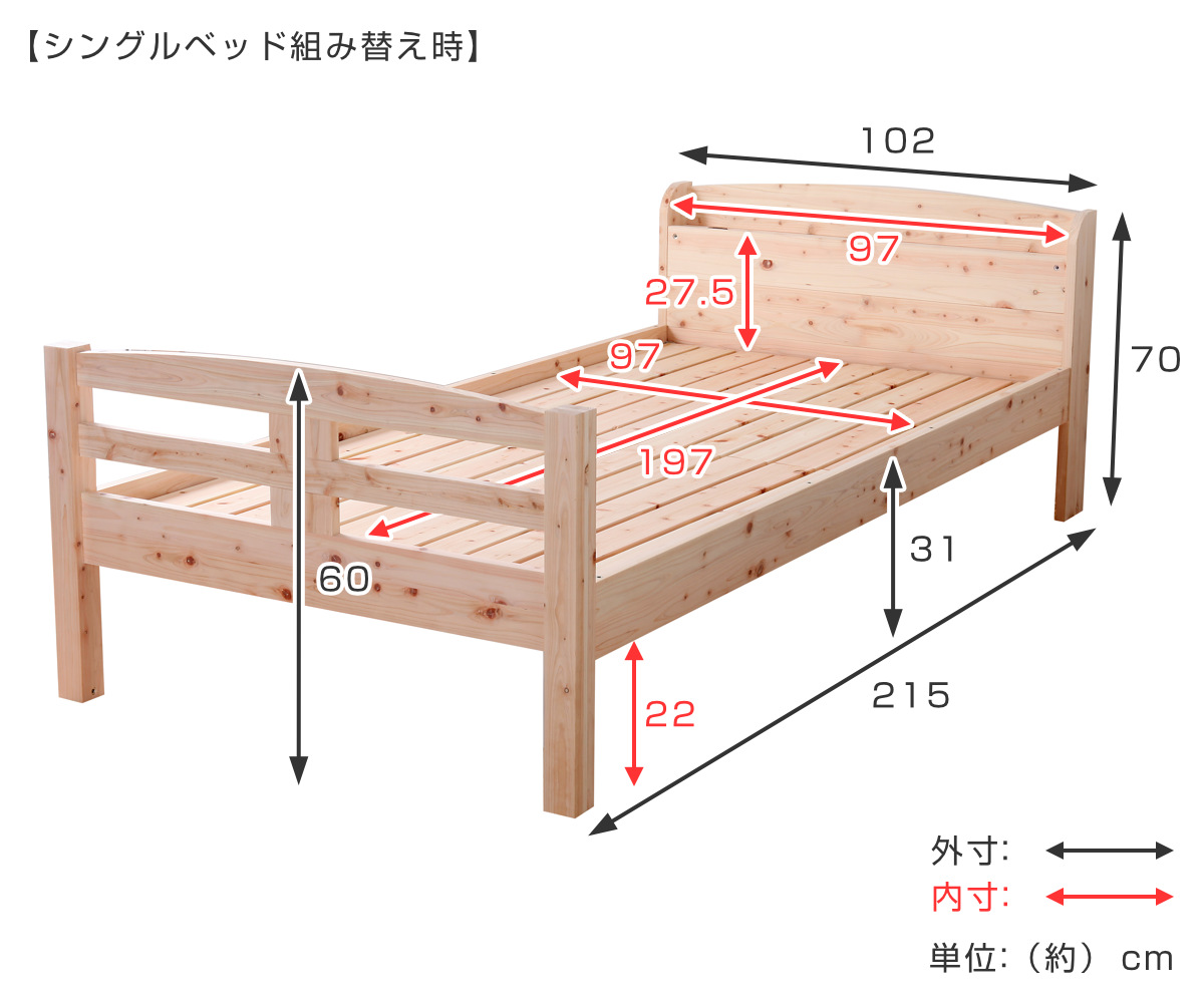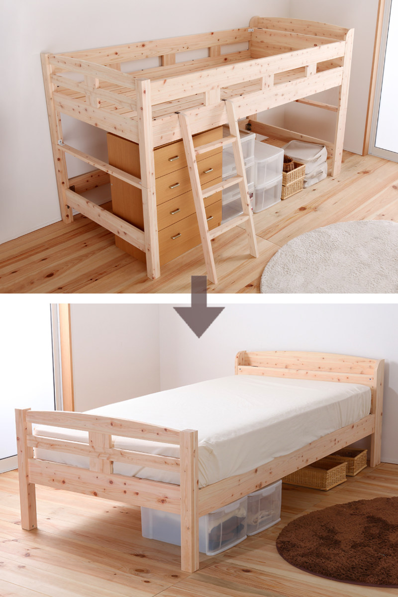 | 注意事項 | 対象年齢:下段4歳以上、上段11歳以上 ※背面は処理されておりませんので壁付けでご使用ください ※天然木を使用している為、1点1点色合いや風合いが異なります |