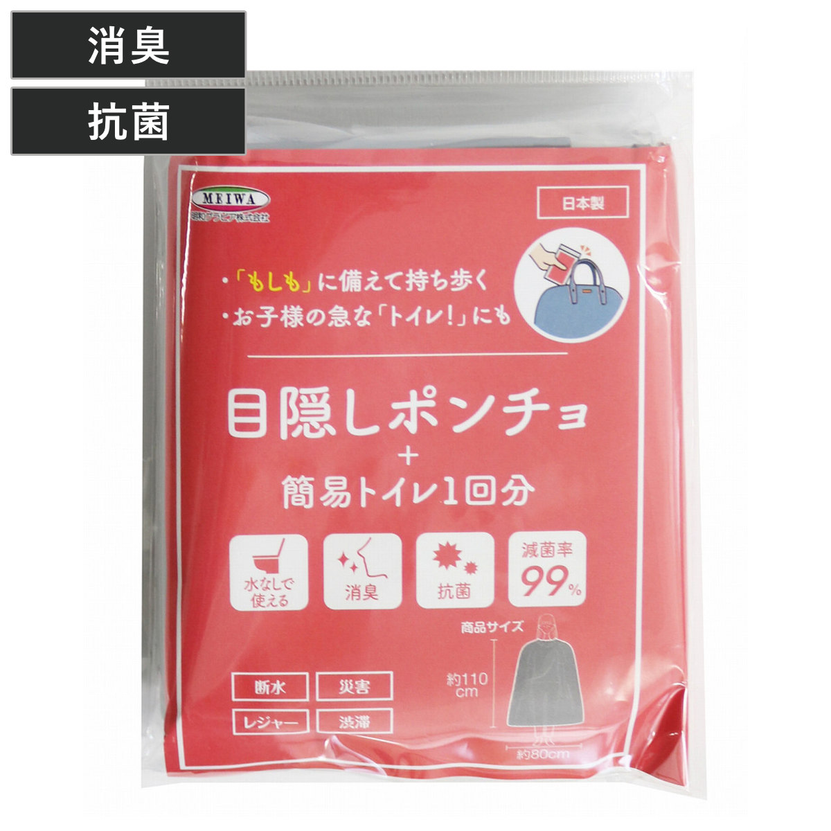 「もしも」に備える目隠しポンチョ&簡易トイレ1回分災害や断水などの非常時やレジャーなど、気になる視線からプライバシーを守る目隠しポンチョと、いざという時に便利な簡易トイレのセットです。日本製のしっかりとした作りで、安心してお使いいただけます。