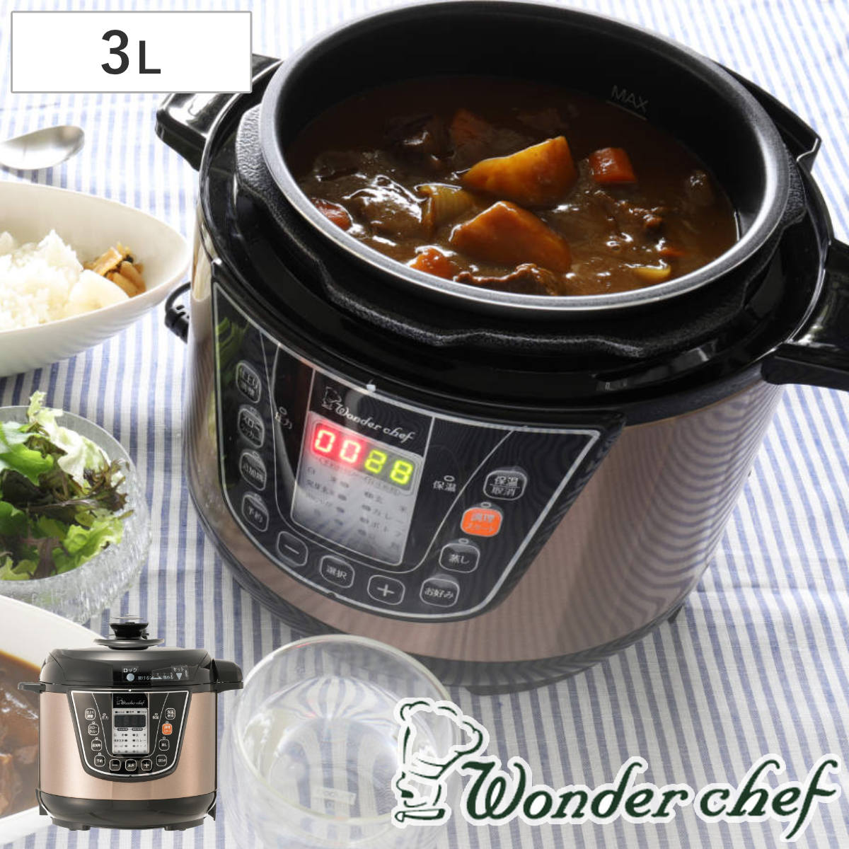 2〜3人分のお料理が作れる3Lサイズ3Lの電気圧力鍋なので、約10皿分(1人前約200g)のカレーを作ることができます。白米なら約2〜4合、玄米なら約2〜3合が炊飯可能なので、2〜3人暮らしの方や、たくさん作り置きをする1人暮らしの方にもおすすめです。