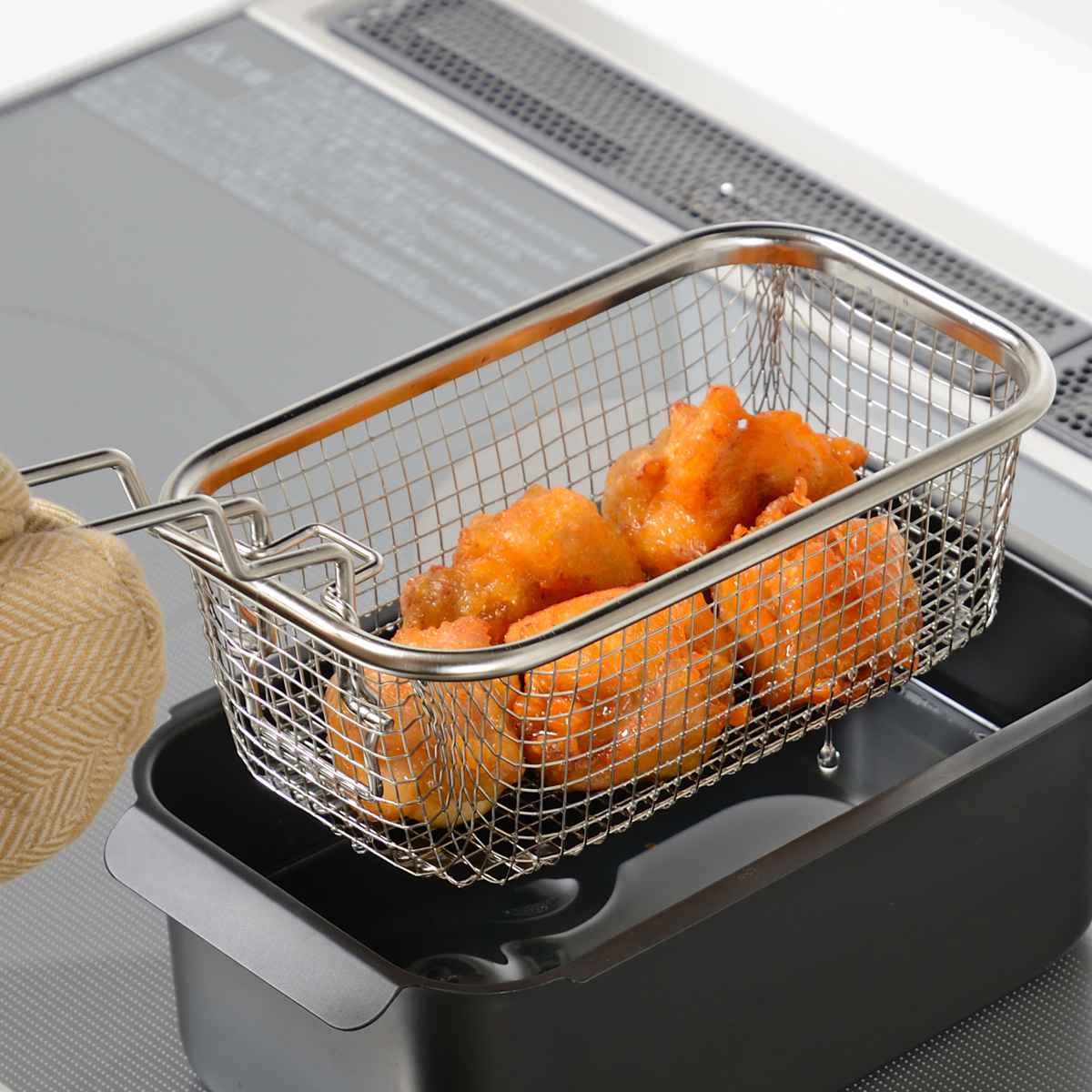 食材の油を一気に切れる角型揚げざるポコフリットシリーズの角型揚げ鍋(別売り)にセットして使える揚げざるです。ポテトなど、つかみにくい食材も揚がったタイミングで一気に引き上げることができるので、揚げ物が苦手な人にもおすすめです。