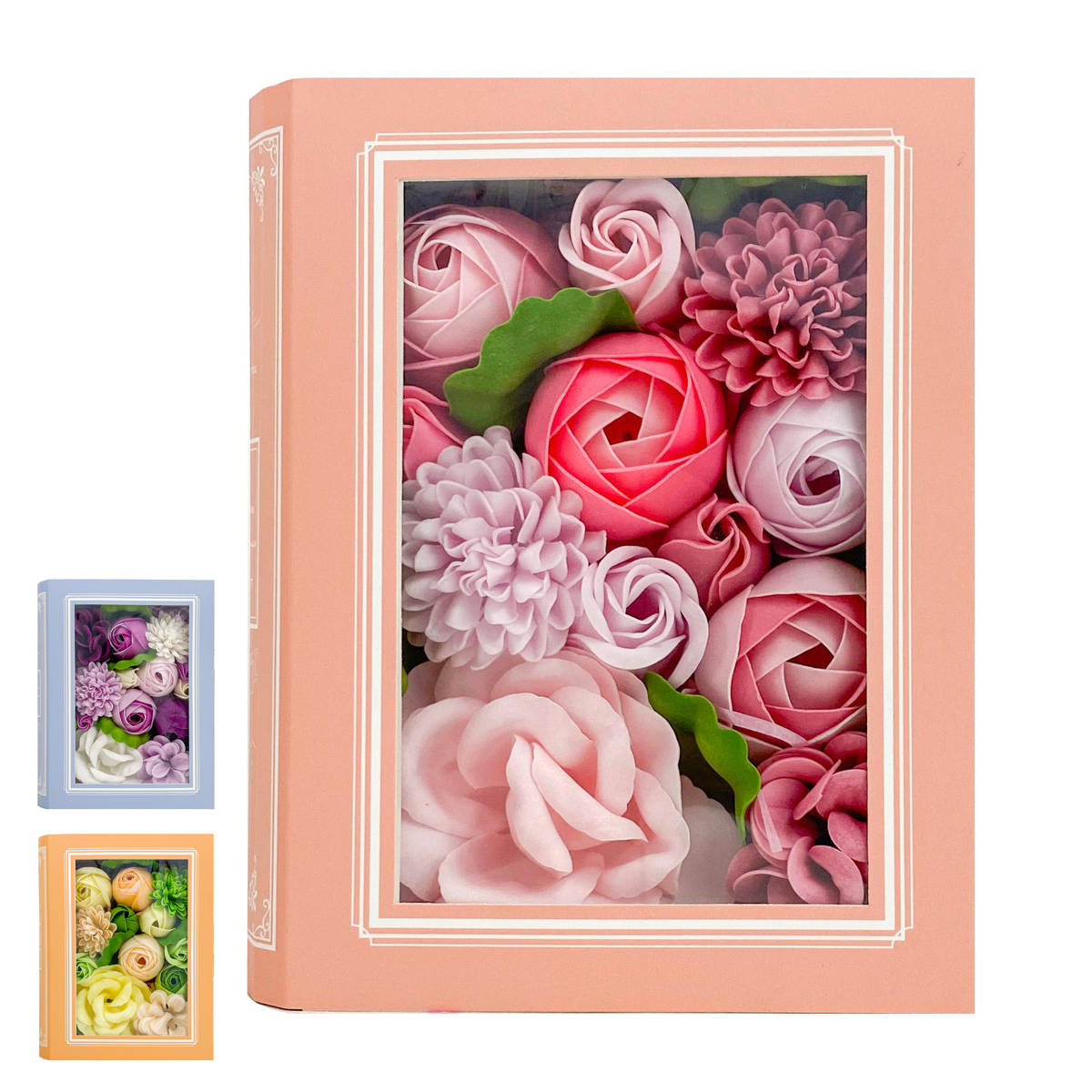 可愛いブック型のボックスお花たちは可愛いブック型のボックスに入っています。本のように立てて飾ったり、開いて飾ったりと楽しむことができ、インテリアのアクセントになります。大切な方へのプレゼントにおすすめです。