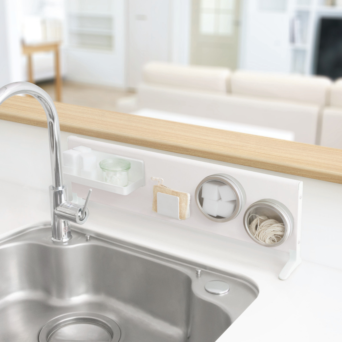 ![]() 縦に長い物に便利な 小物ホルダー | ![]() 厚手のフェイスタオルも干せる ふきん掛け |