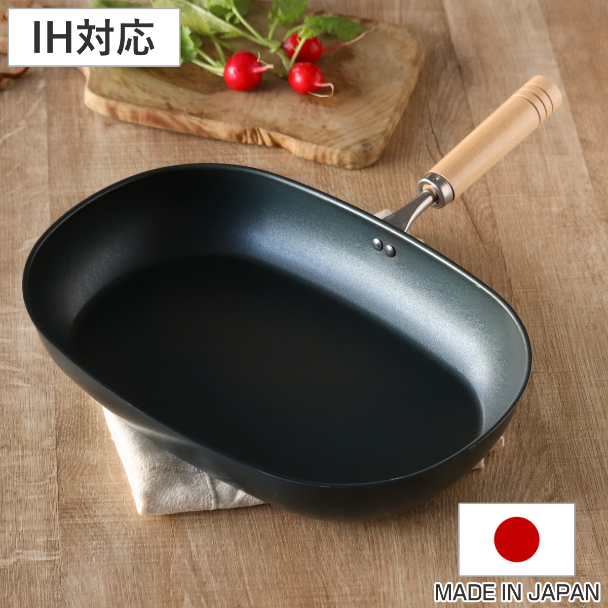 キッチンになじむシンプルデザインするりとした表面の本体と木目柄の取っ手は、使用するキッチンを選ばないシンプルなデザインです。鉄フライパンを感じさせない佇まいで、キッチン空間になじみます。