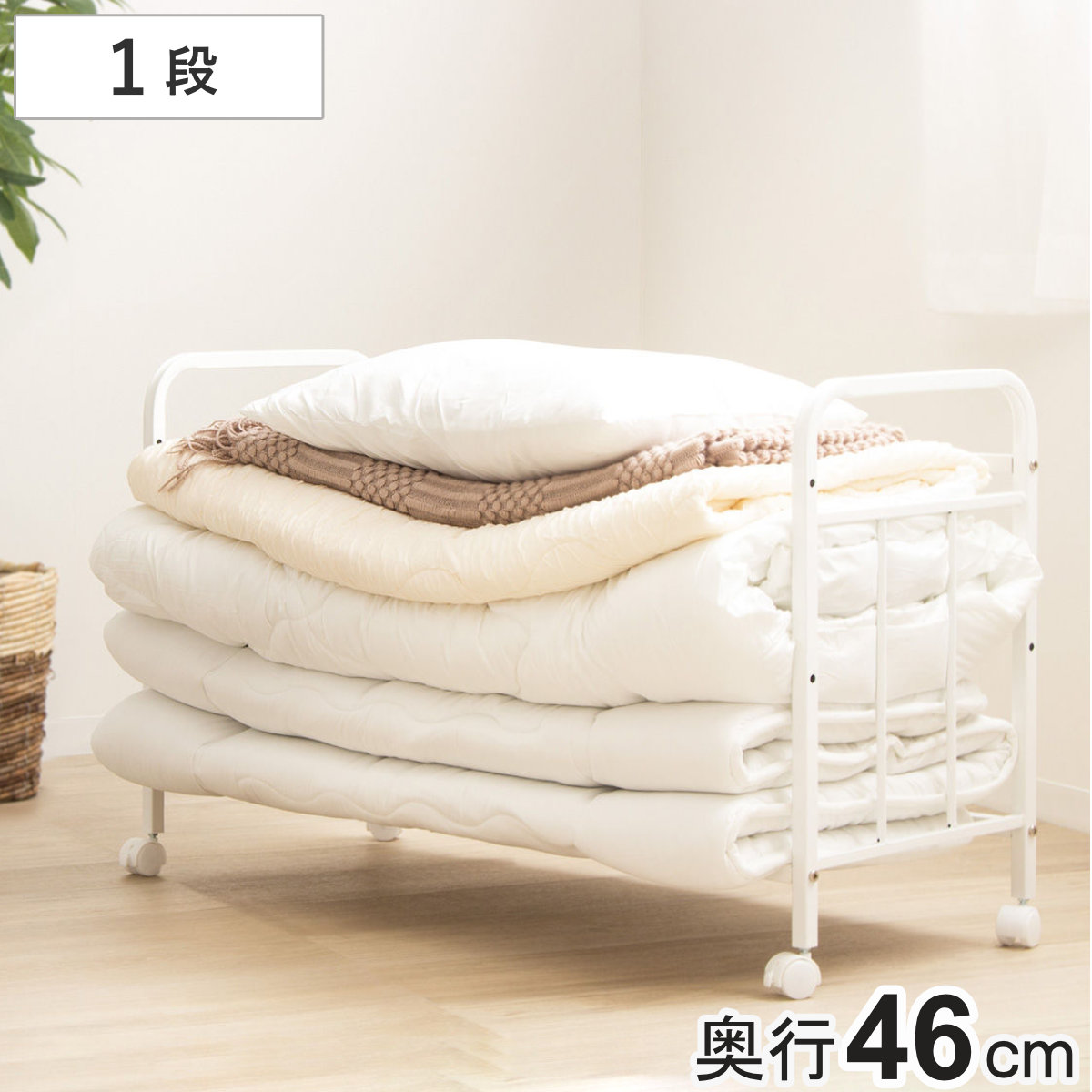 布団収納ラック 1段 スリムタイプ 奥行46cm ( 布団 シングル 収納 寝具 ラック 台 ワゴン キャスター付き 収納ラック 3段階 高さ調節 押し入れ クローゼット )