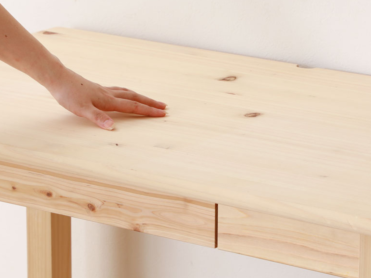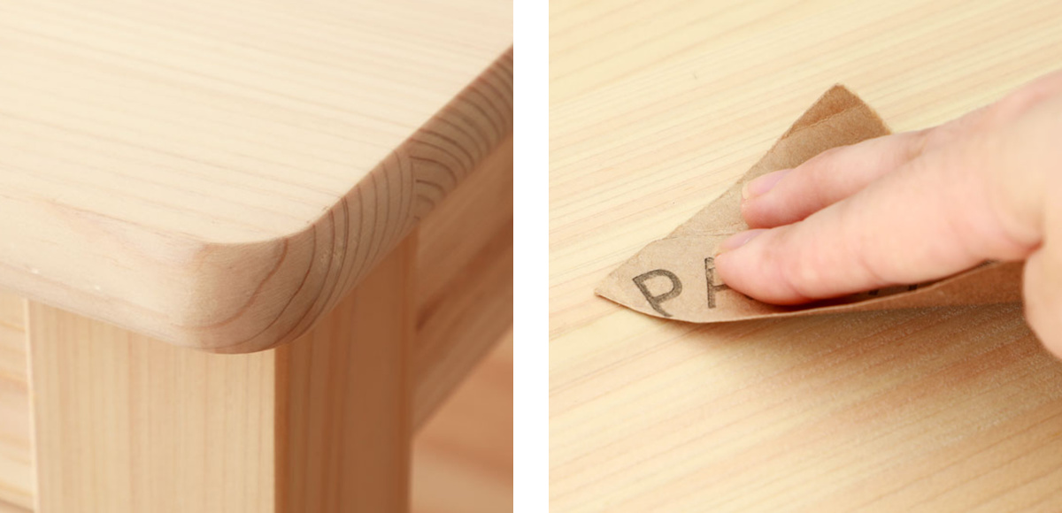 | 角を丸く加工 角をまるく加工しているのでお子様にも安心してご使用いただけます。 | サンドペーパーでお手入れ 汚れがついてもサンドペーパーですれば綺麗になります。擦る際は木目に沿って擦って下さい。 ※番手180〜200のサンドペーパーのご使用がおすすめです |