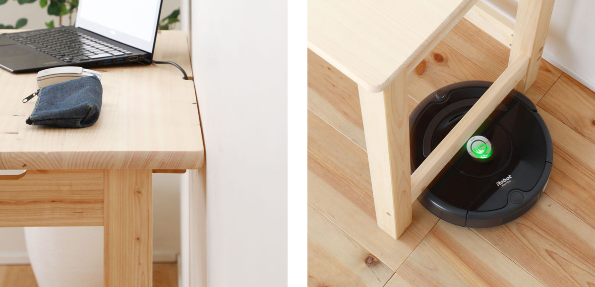 | 壁にピッタリ設置できる 天板が本体より長いので、巾木などをさけて壁にピッタリ付けてお使いいただけます。 | お掃除らくらく 脚部は高さ10cmあり、お掃除ロボットが通れる高さなのでお掃除も簡単です。 |