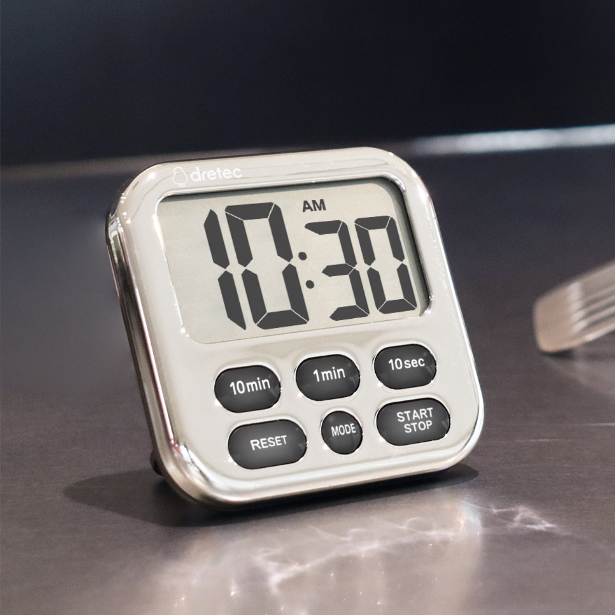 キッチンに馴染むスタイリッシュな時計付タイマー●時計機能が付いて大画面で見やすいキッチンタイマーです。