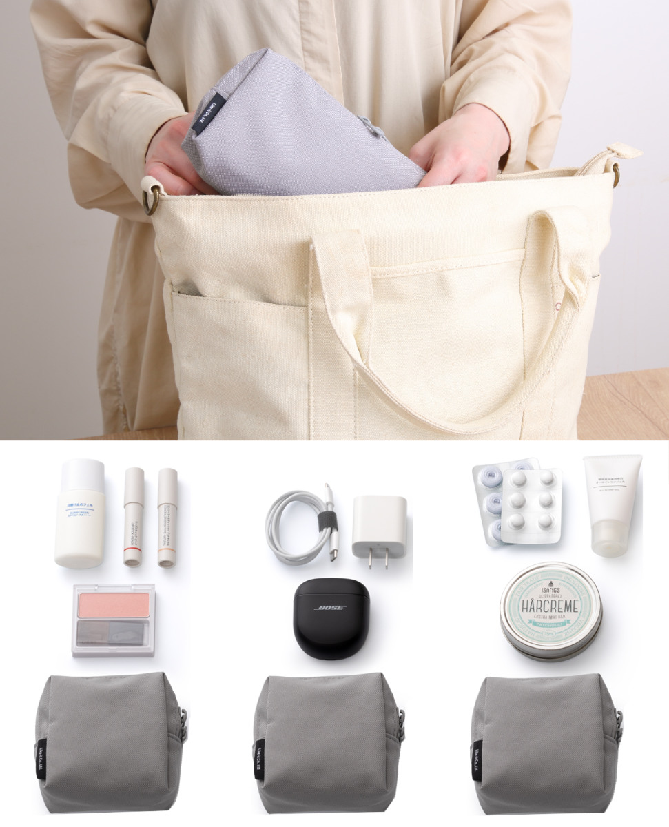 シンプルなポーチなので単体としても汎用性が高く、メイク道具、ガジェット類、トラベル用品や薬類など、用途別にひとまとめにしておけば、お出かけの際にそのままカバンに入れて持ち出せるので便利です。