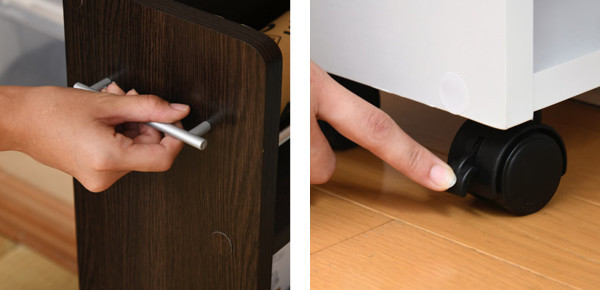 | 握りやすい取っ手付き しっかり握りやすいように指が入る隙間を考えて設計されています。 | ストッパー付きのキャスター 掃除や移動に便利なキャスター付きです。2個はストッパー付きで、設置位置を固定できます。 |