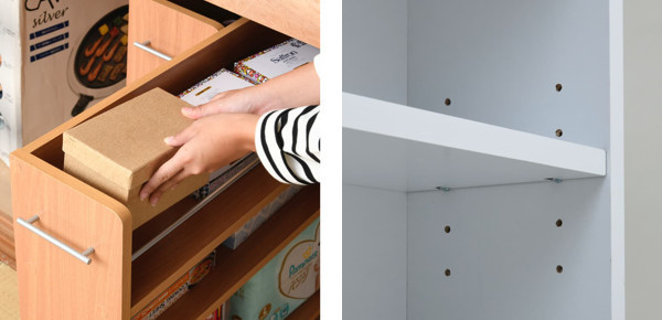 | 取り出しやすいオープン仕様 上部はサッと取り出しやすいオープンタイプです。収納物が落下しないようにバーが付いていて安心です。 | 下段は高さ調節可能な可動棚 下段は3.5ピッチで5段階に調節できる可動棚です。収納するものに合わせて高さを調節できるのでスペースを無駄にしません。 ※上段は固定棚です。 |