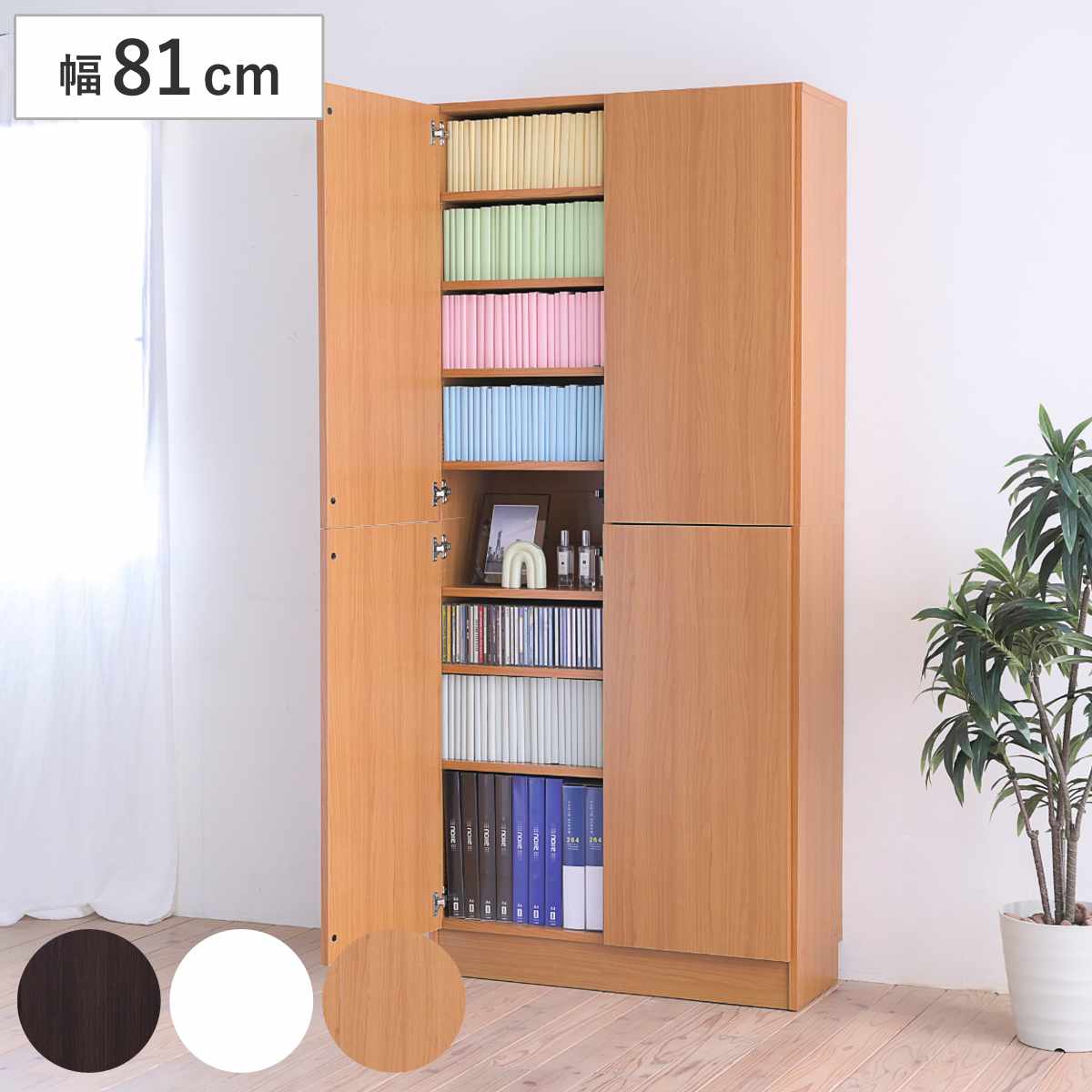 扉で隠してスッキリ収納扉付きなので、見た目もスッキリとスマートな空間になります。来客時などは扉を閉めておけば、目隠し扉として使うことができ便利です。書籍や雑誌以外に日用品や食料品の収納にもお使いいただけます。